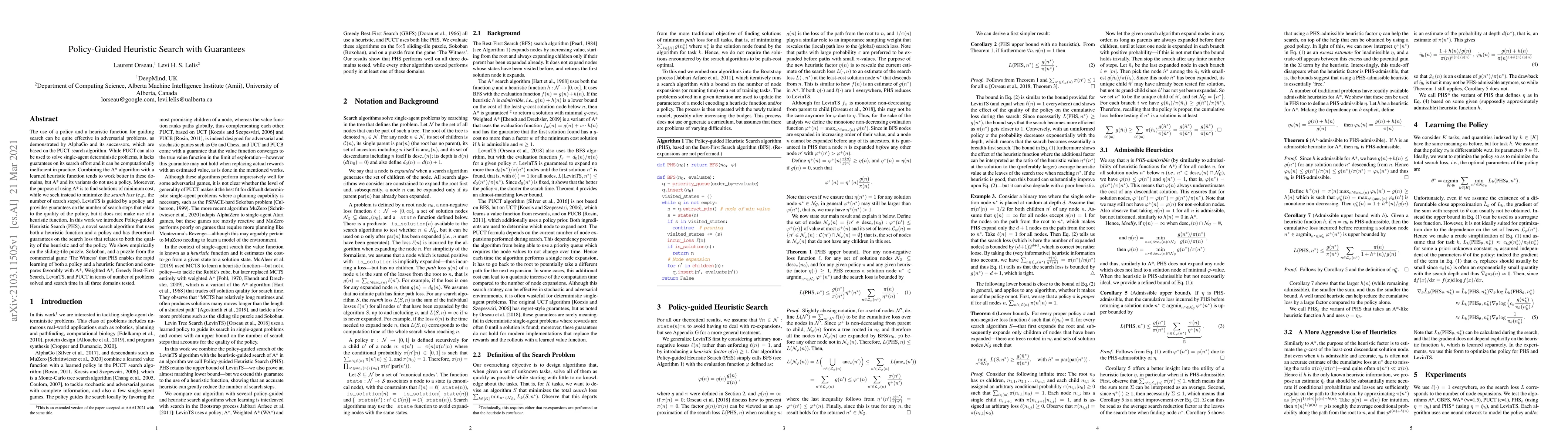 A new search algorithm called Policy-guided Heuristic Search (PHS) combines a heuristic function and a policy to minimize search loss in adversarial problems, providing theoretical guarantees on the number of search steps and outperforming other algorithms.