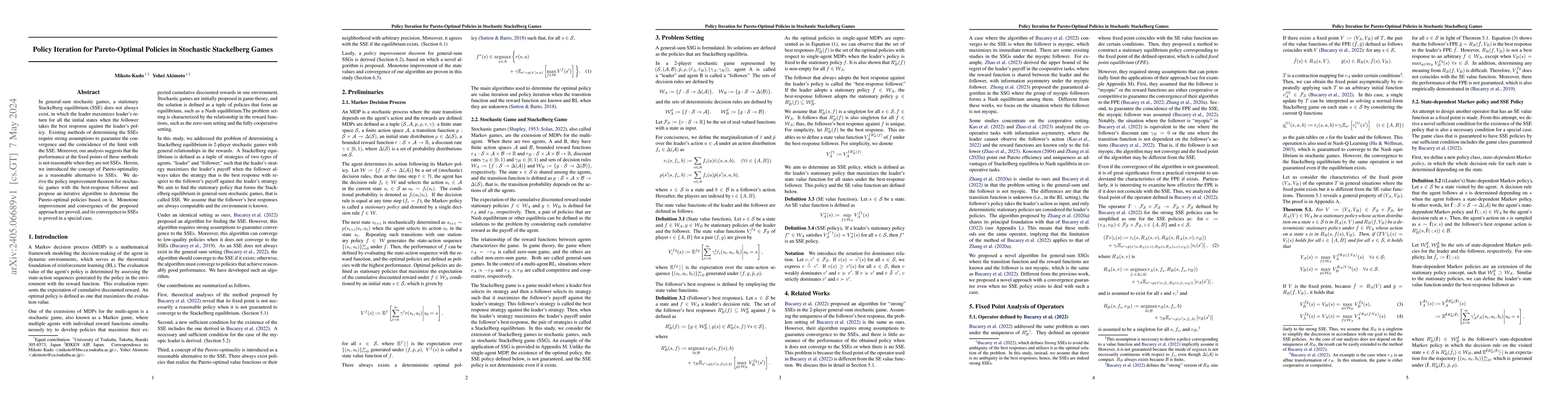 This paper introduces Pareto-optimality as an alternative to stationary Stackelberg equilibrium (SSE) in general-sum stochastic games where SSEs may not exist. The authors propose a policy iteration algorithm based on a derived policy improvement theorem to find Pareto-optimal policies, proving its monotone improvement, convergence, and special case convergence to SSEs.
