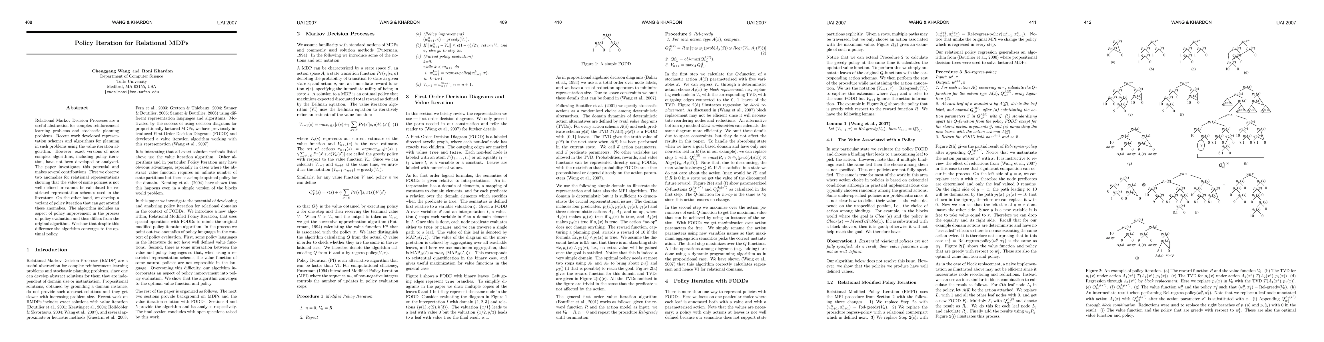 The paper develops a variant of policy iteration for Relational Markov Decision Processes (RMDPs) that overcomes anomalies in existing representation schemes, ensuring convergence to the optimal policy despite modifications in the policy evaluation process. This work fills a gap in the development of complex algorithms for RMDPs.