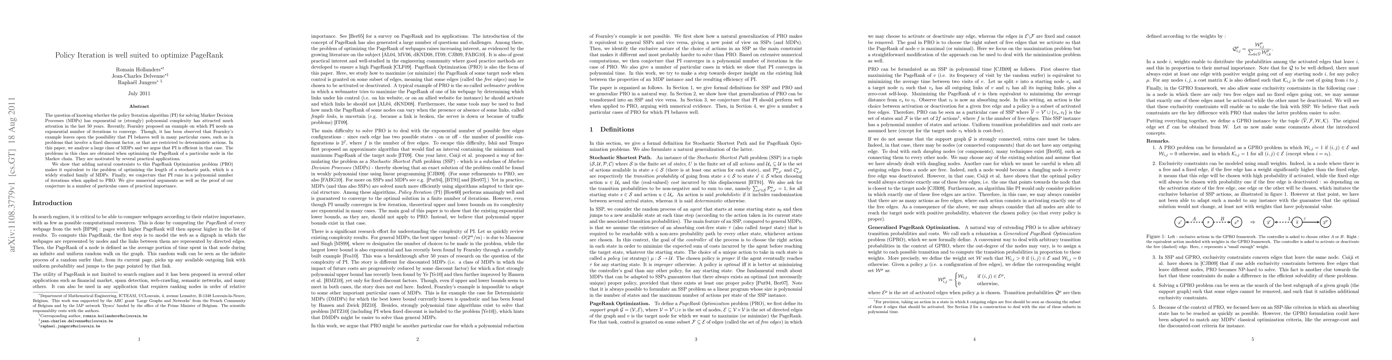 The question of knowing whether the policy Iteration algorithm (PI) for solving Markov Decision Processes (MDPs) has exponential or (strongly) polynomial complexity has attracted much attention in the last 50 years. Recently, Fearnley proposed an example on which PI needs an exponential number of iterations to converge. Though, it has been observed that Fearnley's example leaves open the possibility that PI behaves well in many particular cases, such as in problems that involve a fixed discount factor, or that are restricted to deterministic actions. In this paper, we analyze a large class of MDPs and we argue that PI is efficient in that case. The problems in this class are obtained when optimizing the PageRank of a particular node in the Markov chain. They are motivated by several practical applications. We show that adding natural constraints to this PageRank Optimization problem (PRO) makes it equivalent to the problem of optimizing the length of a stochastic path, which is a widely studied family of MDPs. Finally, we conjecture that PI runs in a polynomial number of iterations when applied to PRO. We give numerical arguments as well as the proof of our conjecture in a number of particular cases of practical importance.