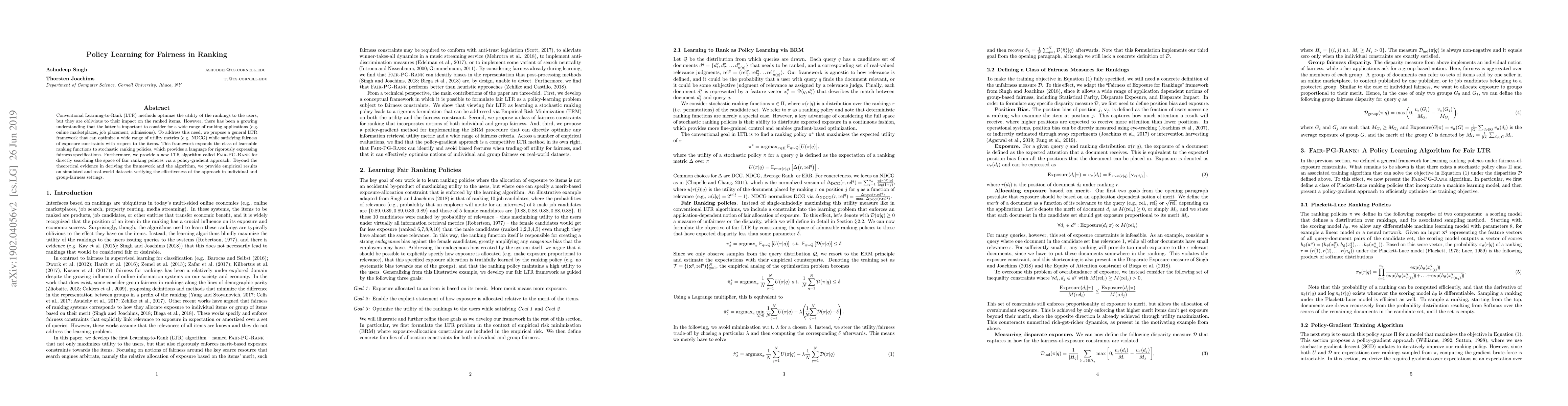 This paper proposes a novel Learning-to-Rank framework that optimizes utility metrics while ensuring fairness in exposure constraints for ranked items. It introduces Fair-PG-Rank, a policy-gradient algorithm for finding fair ranking policies, and demonstrates its effectiveness in both simulated and real-world datasets.