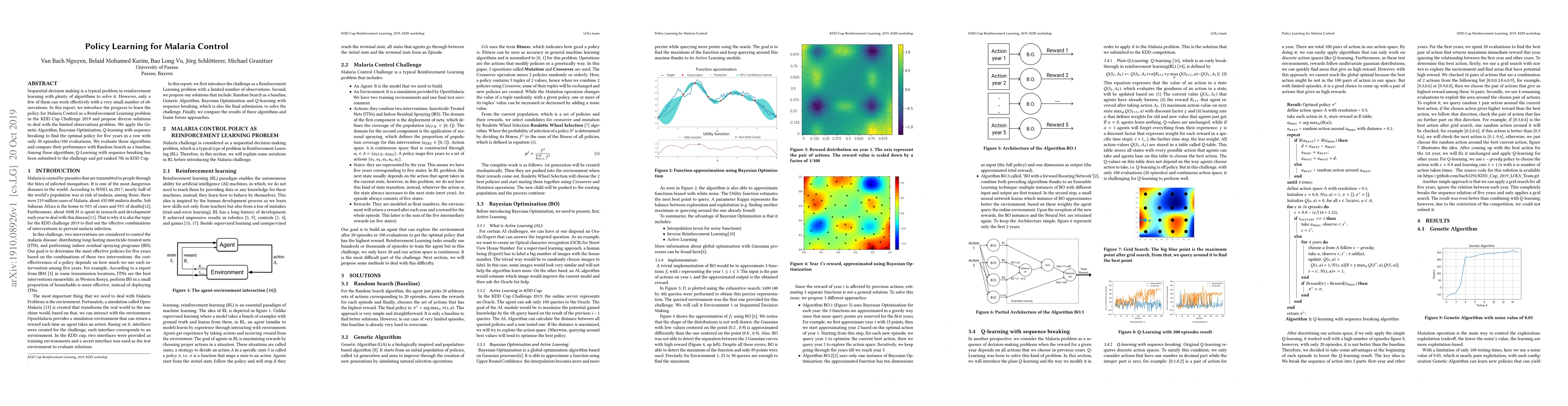 This paper explores reinforcement learning techniques to develop policies for malaria control under limited observation constraints. The authors propose Genetic Algorithm, Bayesian Optimization, and Q-learning with sequence breaking to address the challenge, with Q-learning achieving the best performance and ranking 7th in the KDD Cup Challenge 2019.