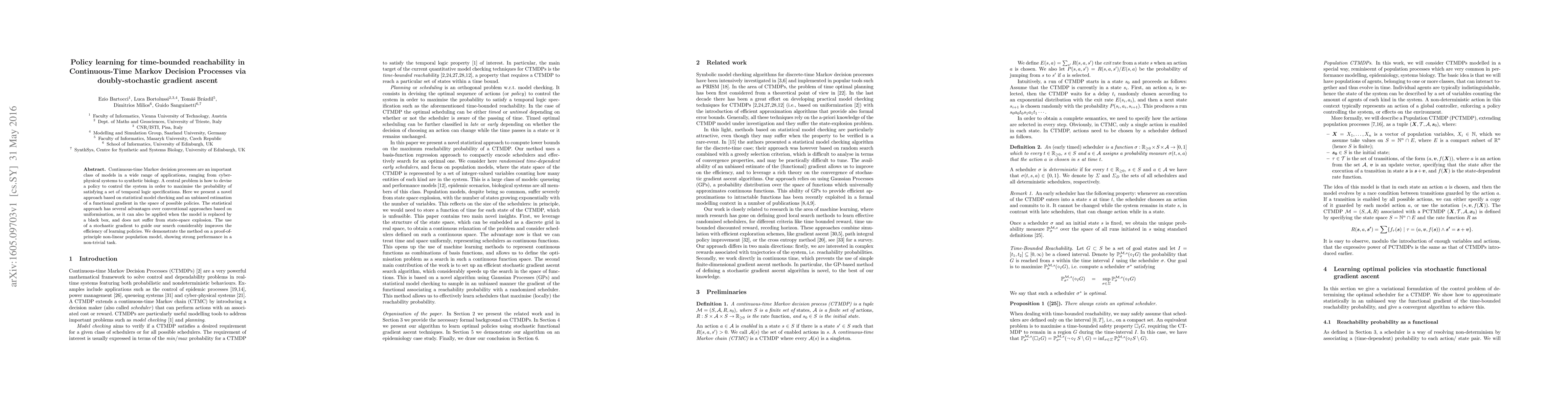 Continuous-time Markov decision processes are an important class of models in a wide range of applications, ranging from cyber-physical systems to synthetic biology. A central problem is how to devise a policy to control the system in order to maximise the probability of satisfying a set of temporal logic specifications. Here we present a novel approach based on statistical model checking and an unbiased estimation of a functional gradient in the space of possible policies. The statistical approach has several advantages over conventional approaches based on uniformisation, as it can also be applied when the model is replaced by a black box, and does not suffer from state-space explosion. The use of a stochastic gradient to guide our search considerably improves the efficiency of learning policies. We demonstrate the method on a proof-of-principle non-linear population model, showing strong performance in a non-trivial task.