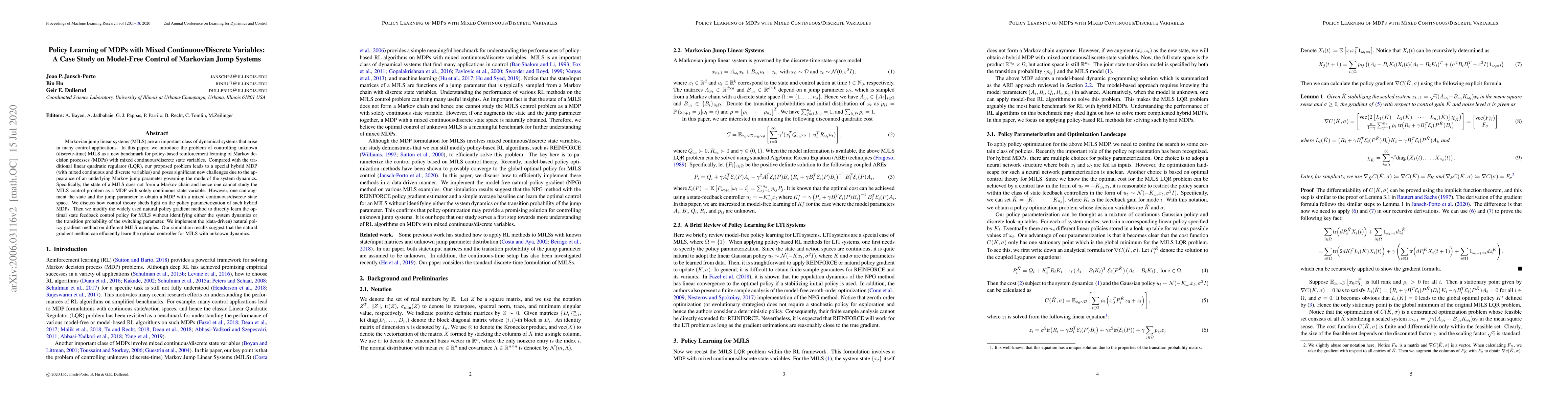 This paper proposes a new benchmark for policy-based reinforcement learning of hybrid Markov decision processes (MDPs) with mixed continuous/discrete variables, focusing on the control of unknown Markovian jump linear systems (MJLS). It modifies the natural policy gradient method to learn optimal state feedback control policies directly without requiring knowledge of system dynamics or transition probabilities.