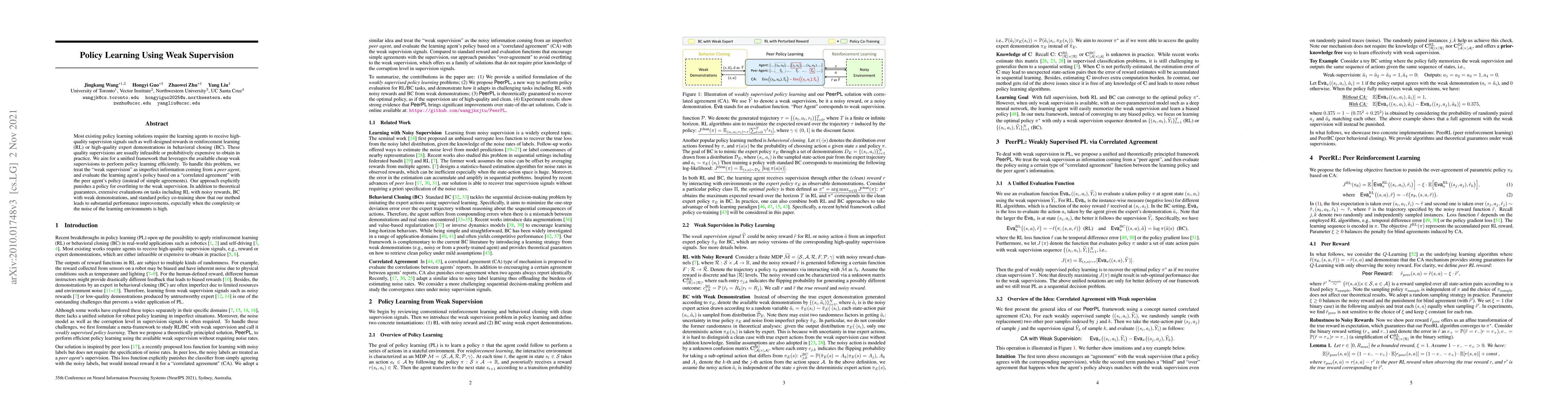 This paper proposes a framework for policy learning using weak supervision, treating weak signals as imperfect peer guidance. It evaluates policies based on "correlated agreement" rather than simple agreement, explicitly penalizing overfitting to weak signals, and demonstrates significant performance improvements in various learning tasks.