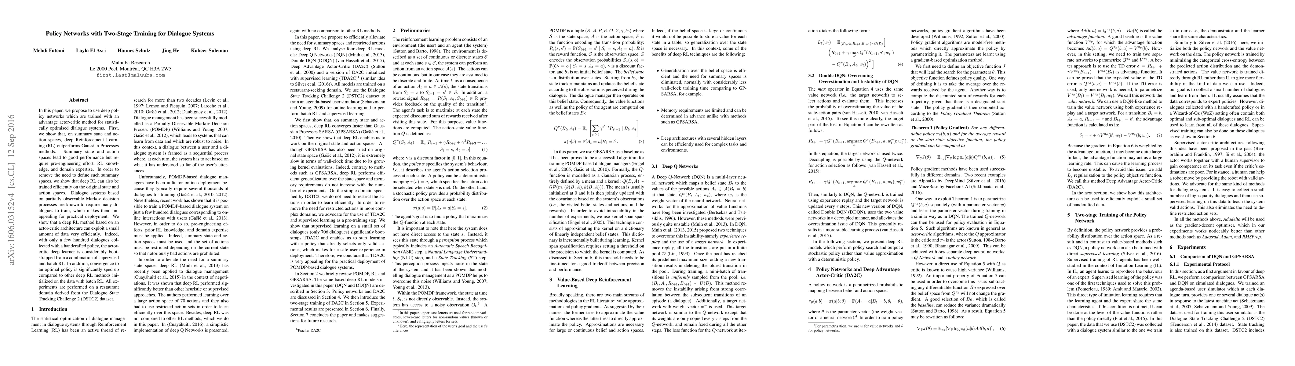 In this paper, we propose to use deep policy networks which are trained with an advantage actor-critic method for statistically optimised dialogue systems. First, we show that, on summary state and action spaces, deep Reinforcement Learning (RL) outperforms Gaussian Processes methods. Summary state and action spaces lead to good performance but require pre-engineering effort, RL knowledge, and domain expertise. In order to remove the need to define such summary spaces, we show that deep RL can also be trained efficiently on the original state and action spaces. Dialogue systems based on partially observable Markov decision processes are known to require many dialogues to train, which makes them unappealing for practical deployment. We show that a deep RL method based on an actor-critic architecture can exploit a small amount of data very efficiently. Indeed, with only a few hundred dialogues collected with a handcrafted policy, the actor-critic deep learner is considerably bootstrapped from a combination of supervised and batch RL. In addition, convergence to an optimal policy is significantly sped up compared to other deep RL methods initialized on the data with batch RL. All experiments are performed on a restaurant domain derived from the Dialogue State Tracking Challenge 2 (DSTC2) dataset.