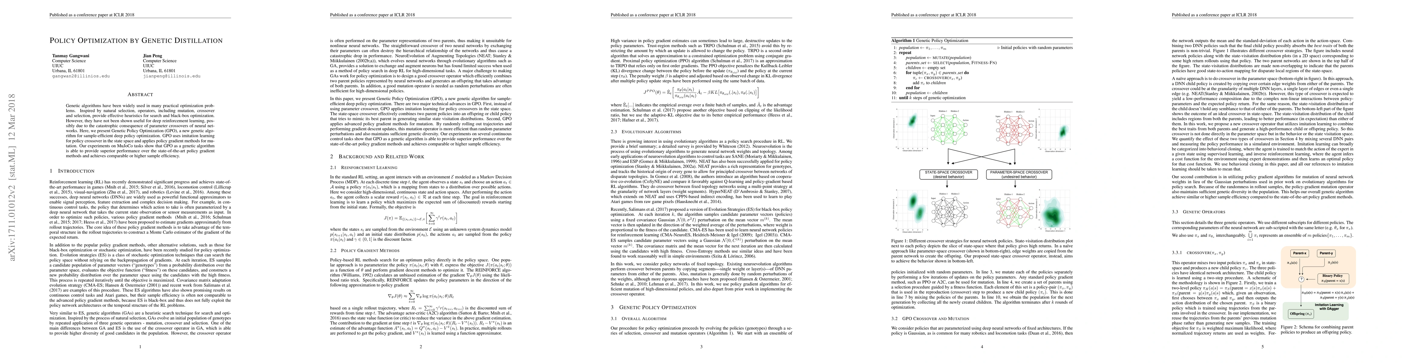 Genetic algorithms have been widely used in many practical optimization problems. Inspired by natural selection, operators, including mutation, crossover and selection, provide effective heuristics for search and black-box optimization. However, they have not been shown useful for deep reinforcement learning, possibly due to the catastrophic consequence of parameter crossovers of neural networks. Here, we present Genetic Policy Optimization (GPO), a new genetic algorithm for sample-efficient deep policy optimization. GPO uses imitation learning for policy crossover in the state space and applies policy gradient methods for mutation. Our experiments on MuJoCo tasks show that GPO as a genetic algorithm is able to provide superior performance over the state-of-the-art policy gradient methods and achieves comparable or higher sample efficiency.