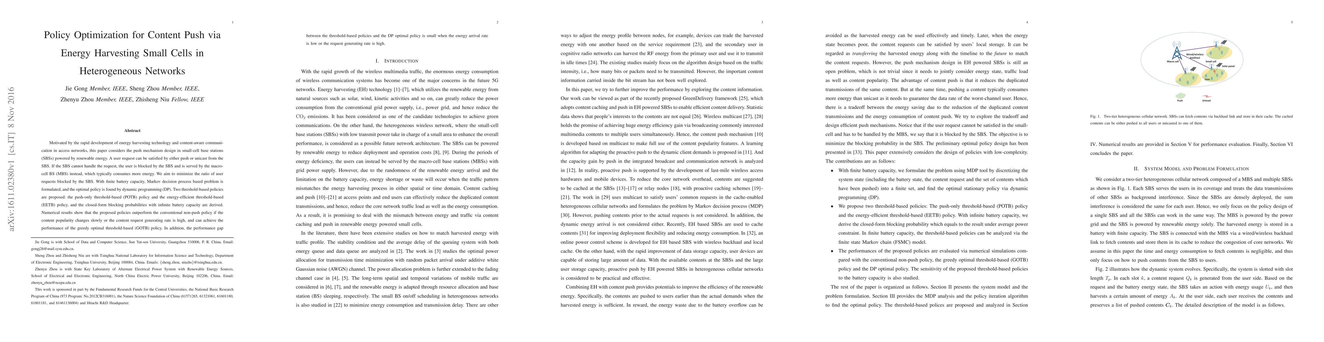 This paper develops policies for energy-harvesting small-cell base stations to optimize content push mechanisms, aiming to minimize user request blocking. It proposes two threshold-based policies and shows they perform well under conditions of low energy arrival rates or high request rates, outperforming conventional non-push methods.