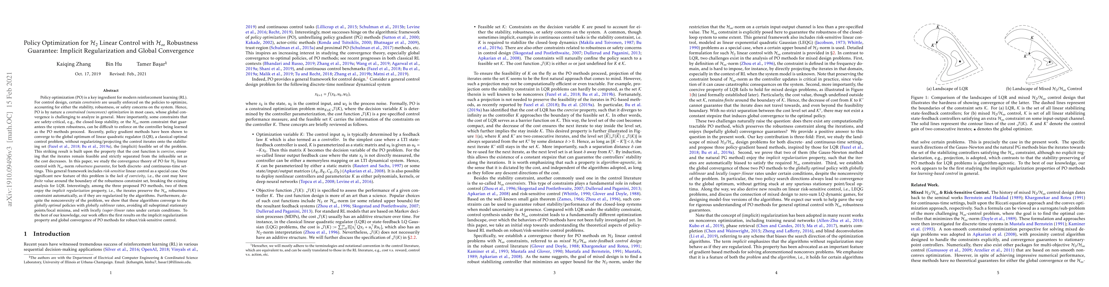 Policy optimization (PO) is a key ingredient for reinforcement learning (RL). For control design, certain constraints are usually enforced on the policies to optimize, accounting for either the stability, robustness, or safety concerns on the system. Hence, PO is by nature a constrained (nonconvex) optimization in most cases, whose global convergence is challenging to analyze in general. More importantly, some constraints that are safety-critical, e.g., the $\mathcal{H}_\infty$-norm constraint that guarantees the system robustness, are difficult to enforce as the PO methods proceed. Recently, policy gradient methods have been shown to converge to the global optimum of linear quadratic regulator (LQR), a classical optimal control problem, without regularizing/projecting the control iterates onto the stabilizing set, its (implicit) feasible set. This striking result is built upon the coercive property of the cost, ensuring that the iterates remain feasible as the cost decreases. In this paper, we study the convergence theory of PO for $\mathcal{H}_2$ linear control with $\mathcal{H}_\infty$-norm robustness guarantee. One significant new feature of this problem is the lack of coercivity, i.e., the cost may have finite value around the feasible set boundary, breaking the existing analysis for LQR. Interestingly, we show that two PO methods enjoy the implicit regularization property, i.e., the iterates preserve the $\mathcal{H}_\infty$ robustness constraint as if they are regularized by the algorithms. Furthermore, despite the nonconvexity of the problem, we show that these algorithms converge to the globally optimal policies with globally sublinear rates, avoiding all suboptimal stationary points/local minima, and with locally (super-)linear rates under certain conditions.