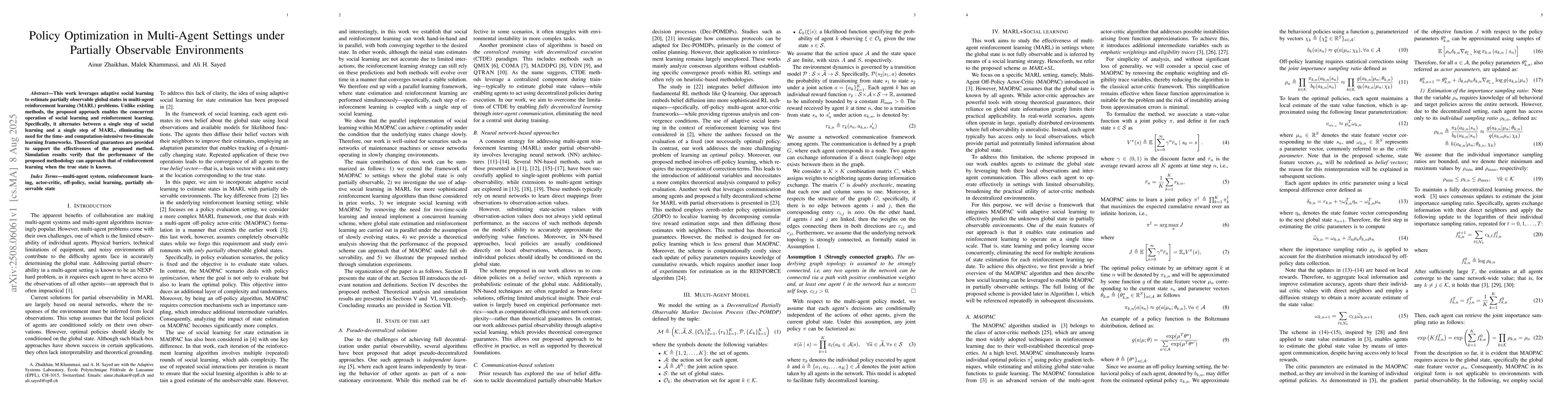 This work leverages adaptive social learning to estimate partially observable global states in multi-agent reinforcement learning (MARL) problems. Unlike existing methods, the proposed approach enables the concurrent operation of social learning and reinforcement learning. Specifically, it alternates between a single step of social learning and a single step of MARL, eliminating the need for the time- and computation-intensive two-timescale learning frameworks. Theoretical guarantees are provided to support the effectiveness of the proposed method. Simulation results verify that the performance of the proposed methodology can approach that of reinforcement learning when the true state is known.
