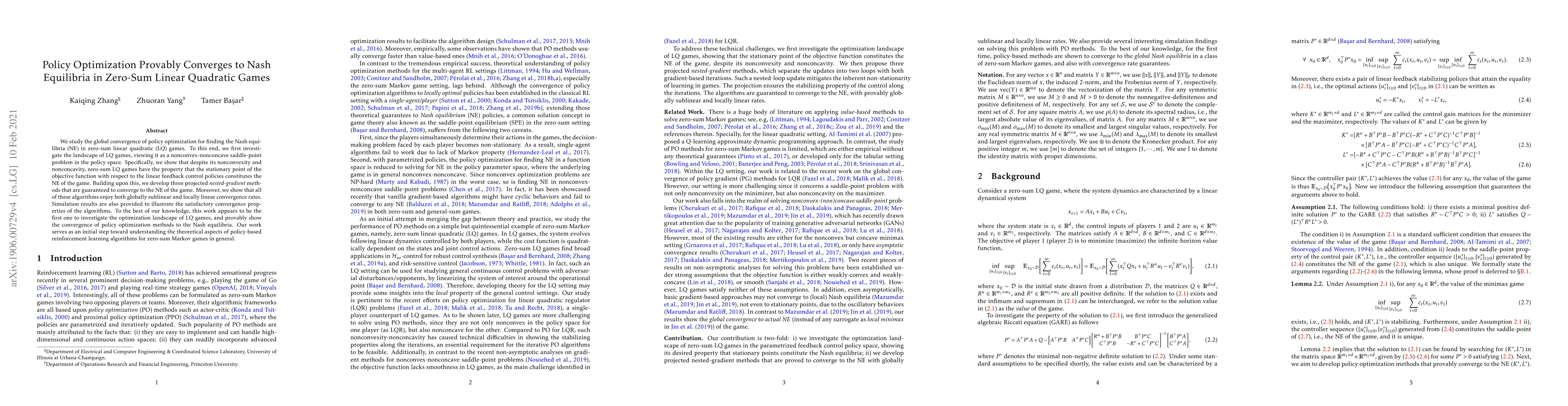 This paper investigates the convergence of policy optimization methods to Nash equilibria in zero-sum linear quadratic games, proving that despite nonconvexity, these methods converge to the equilibria with sublinear global and linear local convergence rates. The study provides three projected nested-gradient algorithms that guarantee convergence and offers initial insights into policy-based reinforcement learning for zero-sum Markov games.