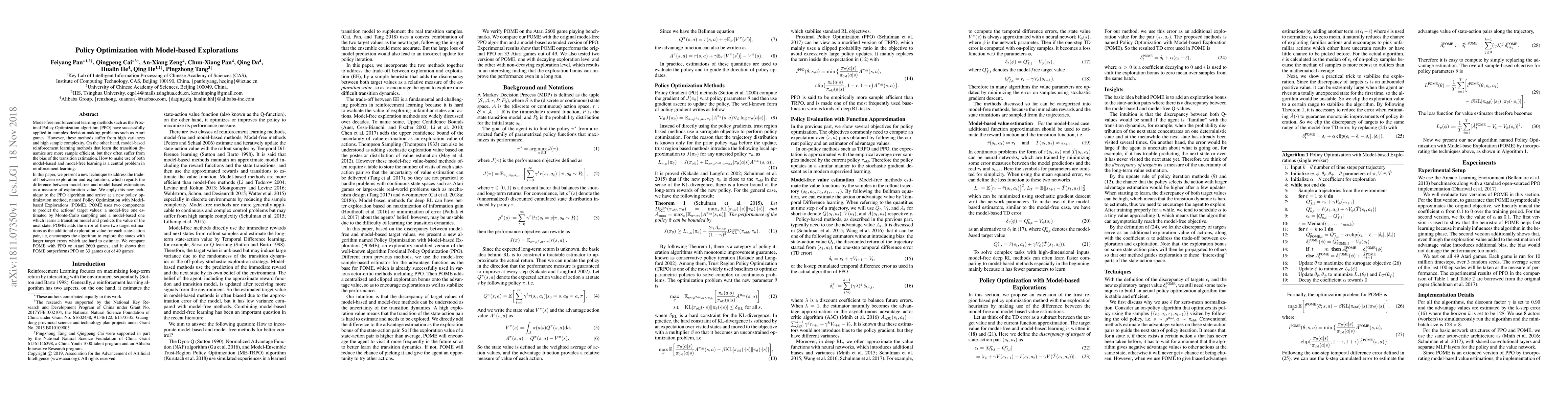A new method, Policy Optimization with Model-based Explorations (POME), combines model-free and model-based reinforcement learning to improve exploration-exploitation trade-off, outperforming PPO on 33 Atari games out of 49.