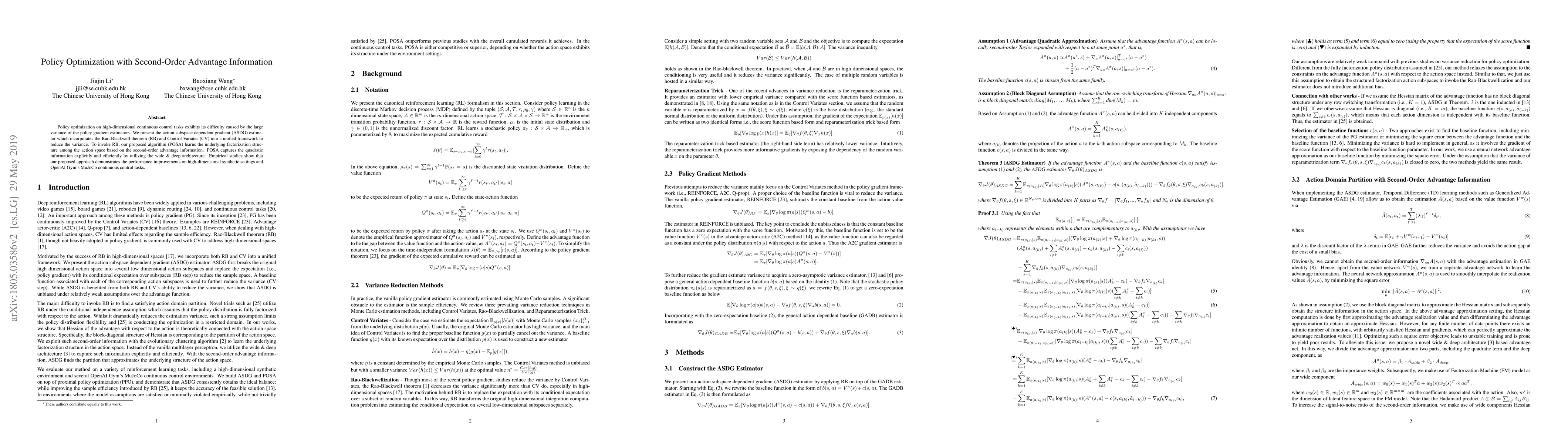 Policy optimization on high-dimensional continuous control tasks exhibits its difficulty caused by the large variance of the policy gradient estimators. We present the action subspace dependent gradient (ASDG) estimator which incorporates the Rao-Blackwell theorem (RB) and Control Variates (CV) into a unified framework to reduce the variance. To invoke RB, our proposed algorithm (POSA) learns the underlying factorization structure among the action space based on the second-order advantage information. POSA captures the quadratic information explicitly and efficiently by utilizing the wide & deep architecture. Empirical studies show that our proposed approach demonstrates the performance improvements on high-dimensional synthetic settings and OpenAI Gym's MuJoCo continuous control tasks.