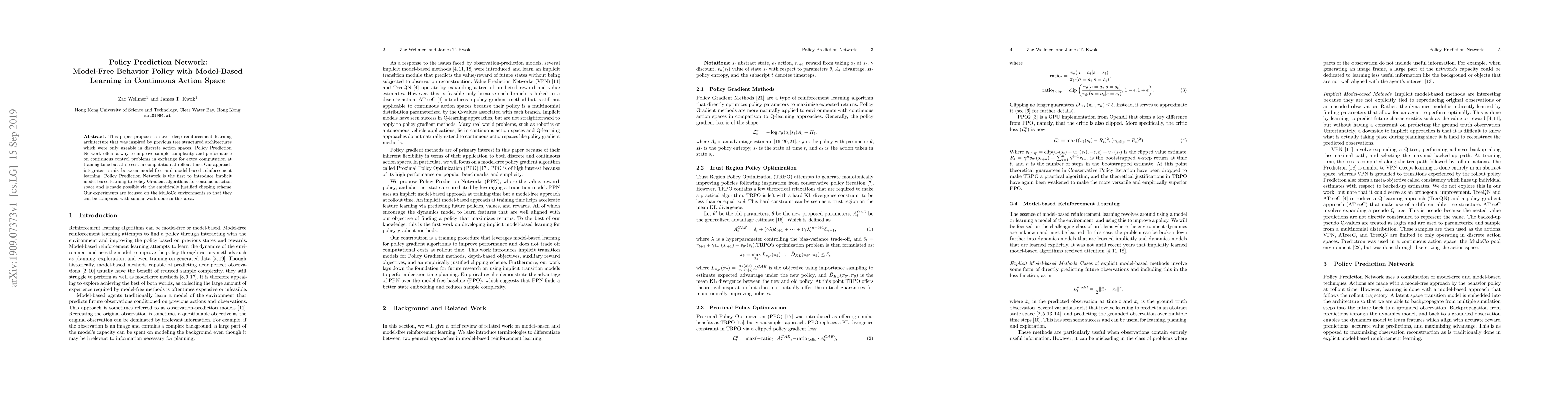 This paper introduces Policy Prediction Network, a novel deep reinforcement learning model combining model-free and model-based learning to enhance sample efficiency and performance in continuous control tasks, using a clipping scheme for continuous action spaces. Experiments in MuJoCo environments demonstrate its effectiveness.
