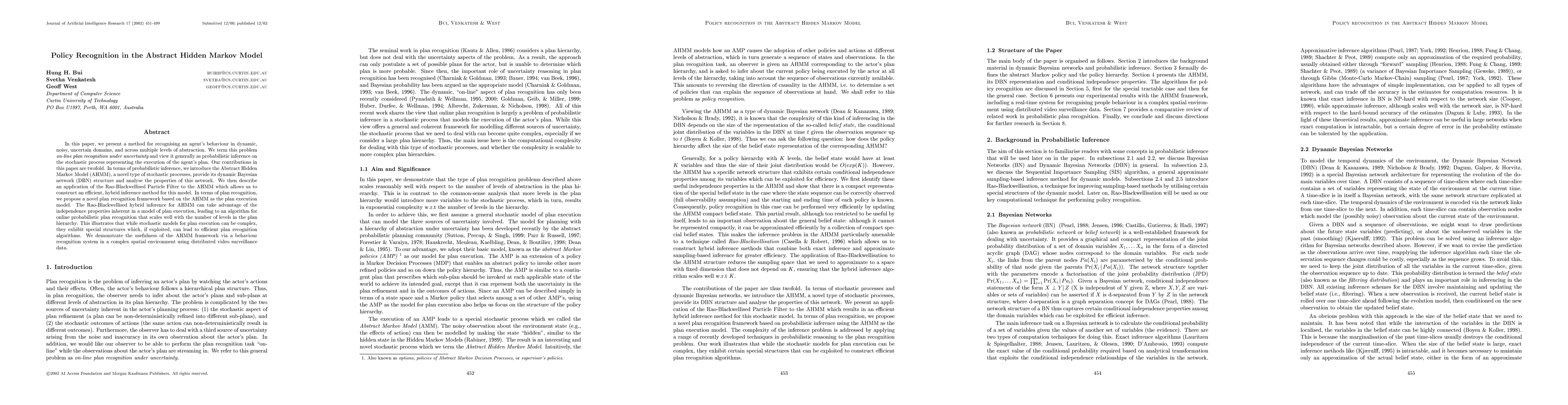In this paper, we present a method for recognising an agent's behaviour in dynamic, noisy, uncertain domains, and across multiple levels of abstraction. We term this problem on-line plan recognition under uncertainty and view it generally as probabilistic inference on the stochastic process representing the execution of the agent's plan. Our contributions in this paper are twofold. In terms of probabilistic inference, we introduce the Abstract Hidden Markov Model (AHMM), a novel type of stochastic processes, provide its dynamic Bayesian network (DBN) structure and analyse the properties of this network. We then describe an application of the Rao-Blackwellised Particle Filter to the AHMM which allows us to construct an efficient, hybrid inference method for this model. In terms of plan recognition, we propose a novel plan recognition framework based on the AHMM as the plan execution model. The Rao-Blackwellised hybrid inference for AHMM can take advantage of the independence properties inherent in a model of plan execution, leading to an algorithm for online probabilistic plan recognition that scales well with the number of levels in the plan hierarchy. This illustrates that while stochastic models for plan execution can be complex, they exhibit special structures which, if exploited, can lead to efficient plan recognition algorithms. We demonstrate the usefulness of the AHMM framework via a behaviour recognition system in a complex spatial environment using distributed video surveillance data.