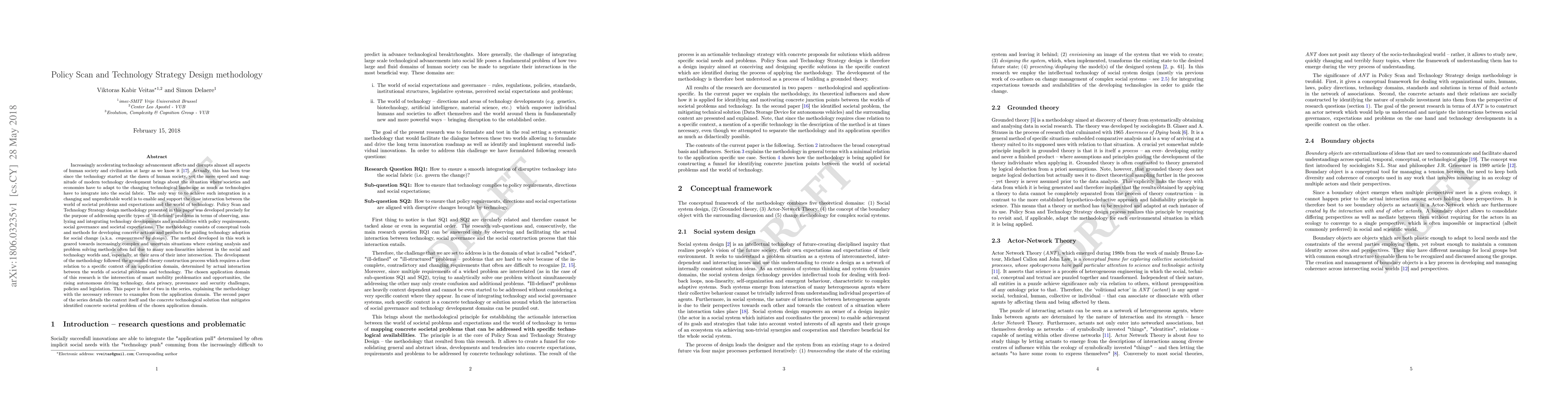 Increasingly accelerating technology advancement affects and disrupts almost all aspects of human society and civilization at large as we know it. Actually, this has been true since the technology started at the dawn of human society, yet the mere speed and magnitude of modern technology development brings about the situation where societies and economies have to adapt to the changing technological landscape as much as technologies have to integrate into the social fabric. The way to to achieve such integration in a changing and unpredictable world is to support the close interaction between the world of societal expectations and the world of technology. Policy Scan and Technology Strategy design methodology presented in this paper was developed precisely for the purpose of addressing specific types of 'ill-defined' problems in terms of observing, analyzing and integrating technology developments and availabilities with policy requirements, social governance and societal expectations. The methodology consists of conceptual tools and methods for developing concrete actions and products for guiding technology adoption for social change. It is geared towards increasingly complex and uncertain situations where existing analysis and problem solving methods often fail due to many non-linearities inherent in the social and technology worlds and, especially, at their area of their inter intersection. The development of the methodology followed the grounded theory construction process which requires a close relation to a specific context of an application domain, determined by actual interaction between the worlds of societal problems and technology. The chosen application domain of this research is the intersection of smart mobility problematics and opportunities, the rising autonomous driving technology, data privacy, provenance and security challenges, policies and legislation.