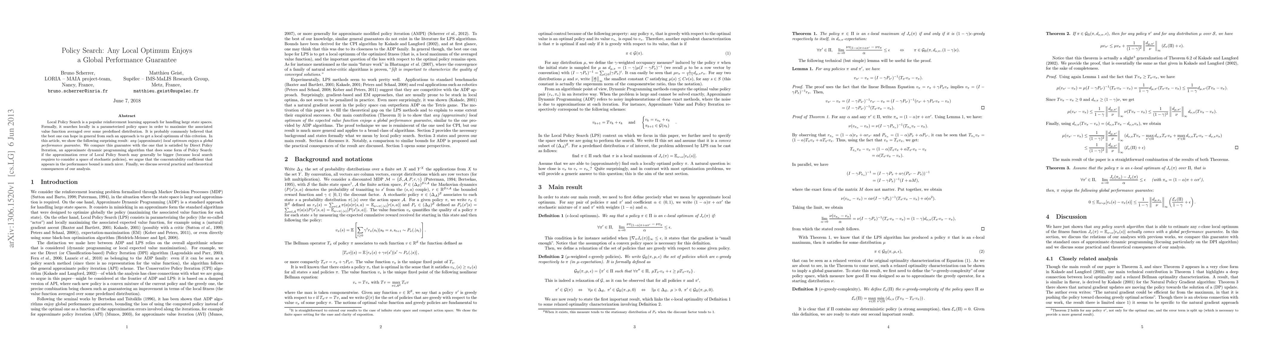 Local Policy Search is a popular reinforcement learning approach for handling large state spaces. Formally, it searches locally in a paramet erized policy space in order to maximize the associated value function averaged over some predefined distribution. It is probably commonly b elieved that the best one can hope in general from such an approach is to get a local optimum of this criterion. In this article, we show th e following surprising result: \emph{any} (approximate) \emph{local optimum} enjoys a \emph{global performance guarantee}. We compare this g uarantee with the one that is satisfied by Direct Policy Iteration, an approximate dynamic programming algorithm that does some form of Poli cy Search: if the approximation error of Local Policy Search may generally be bigger (because local search requires to consider a space of s tochastic policies), we argue that the concentrability coefficient that appears in the performance bound is much nicer. Finally, we discuss several practical and theoretical consequences of our analysis.