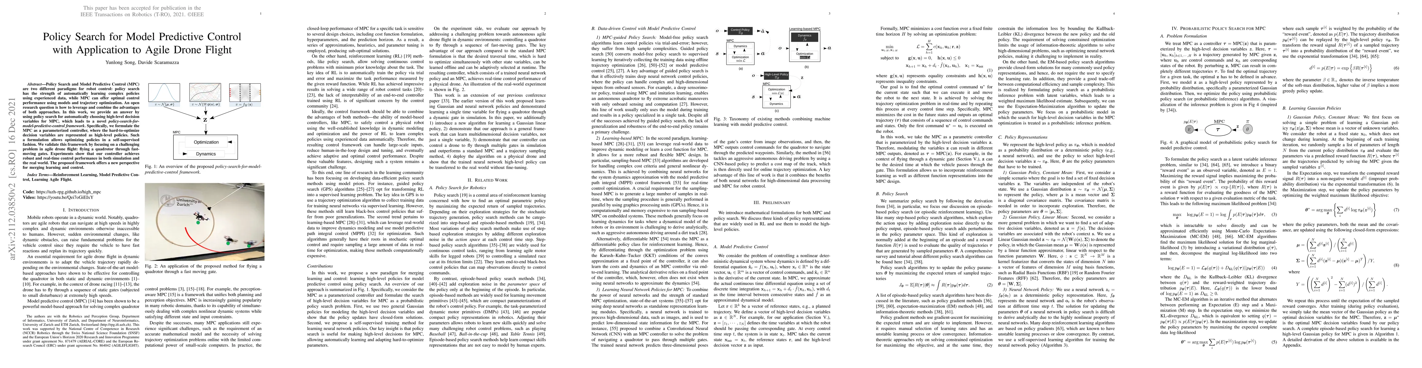 This paper proposes a novel framework combining policy search and Model Predictive Control (MPC) to optimize high-level decision variables for agile drone flight. The approach leverages policy search to automatically choose these variables, achieving robust and real-time control performance in both simulation and real-world scenarios.