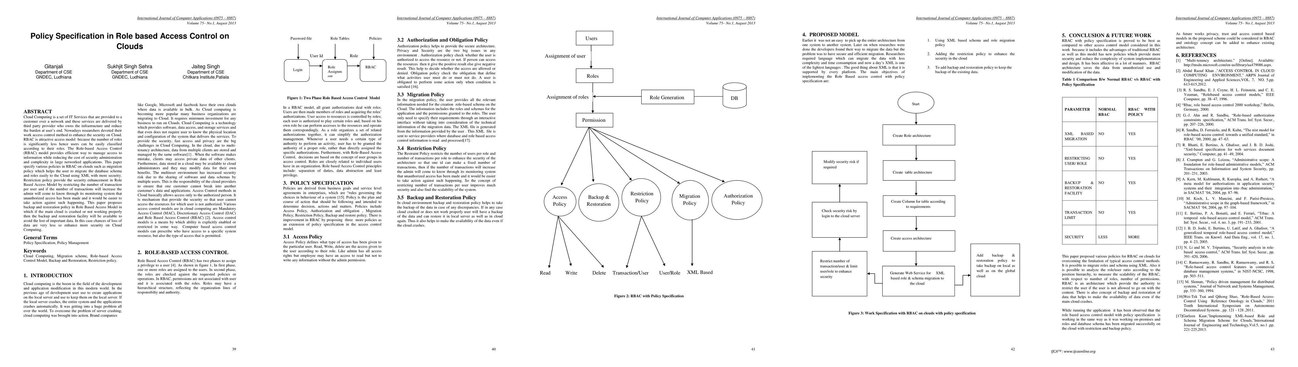 Cloud Computing is a set of IT Services that are provided to a customer over a network and these services are delivered by third party provider who owns the infrastructure and reduce the burden at user's end. Nowadays researchers devoted their work access control method to enhance the security on Cloud. RBAC is attractive access model because the number of roles is significantly less hence users can be easily classified according to their roles. The Role-based Access Control (RBAC) model provides efficient way to manage access to information while reducing the cost of security administration and complexity in large networked applications. This paper specify various policies in RBAC on clouds such as migration policy which helps the user to migrate the database schema and roles easily to the Cloud using XML with more security. Restriction policy provide the security enhancement in Role Based Access Model by restricting the number of transaction per user and if the number of transactions will increase the admin will come to know through its monitoring system that unauthorized access has been made and it would be easier to take action against such happening. This paper proposes backup and restoration policy in Role Based Access Model in which if the main cloud is crashed or not working properly then the backup and restoration facility will be available to avoid the lost of important data. In this case chances of loss of data are very less so enhance more security on Cloud Computing.