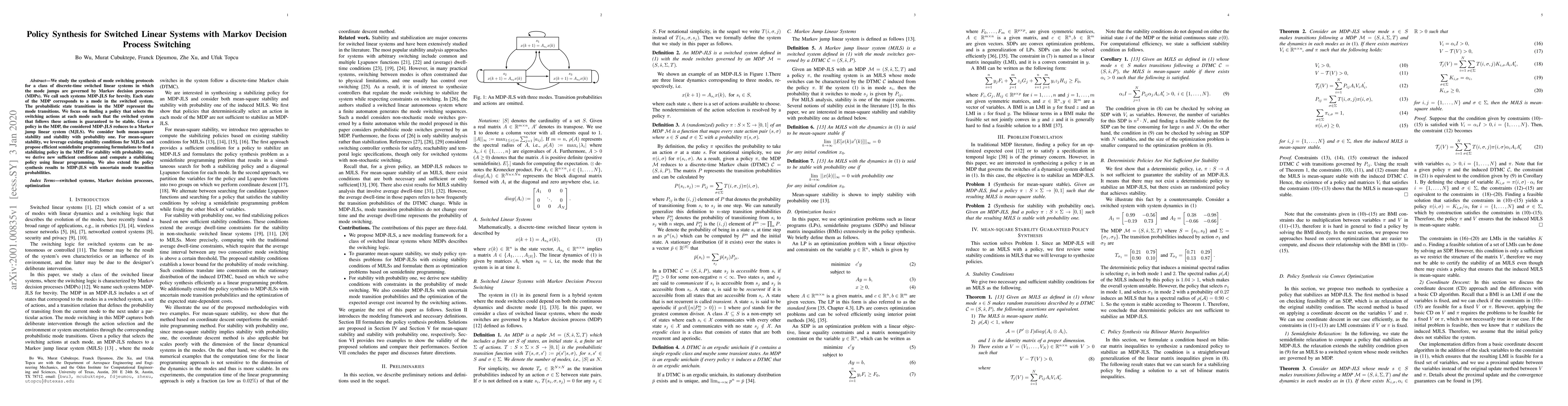 This paper investigates the synthesis of switching protocols for switched linear systems where mode transitions are governed by Markov decision processes (MDPs). It aims to find policies ensuring stability, addressing both mean-square stability and stability with probability one, using semidefinite and linear programming techniques.