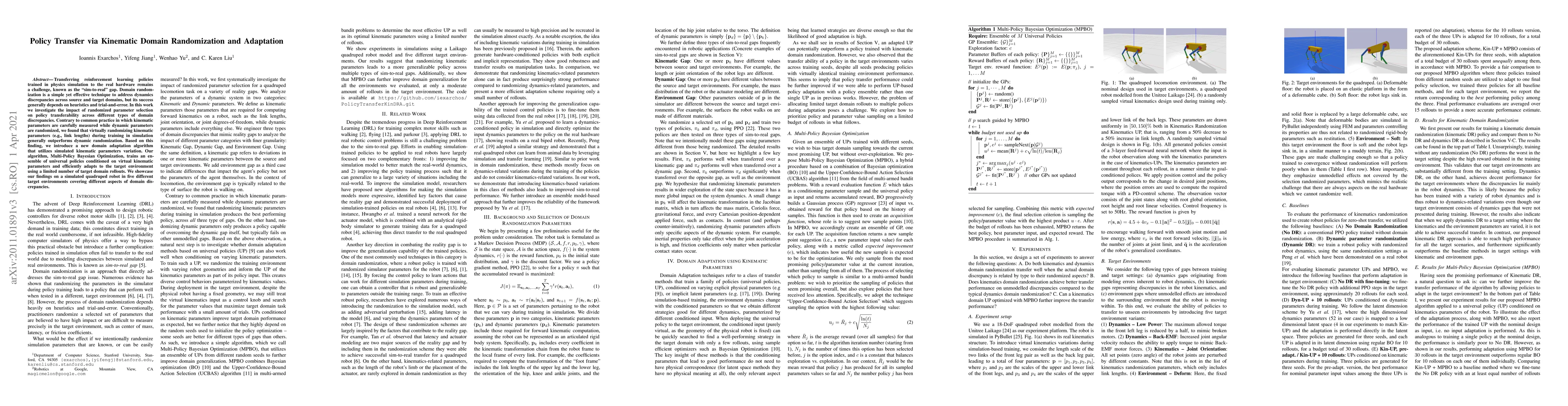 This research explores the 'sim-to-real' gap in reinforcement learning, finding that randomizing kinematic parameters during simulation training enhances policy transferability. A new algorithm, Multi-Policy Bayesian Optimization, is introduced, which trains universal policies conditioned on varied kinematic parameters, efficiently adapting to target environments with minimal real-world interactions.