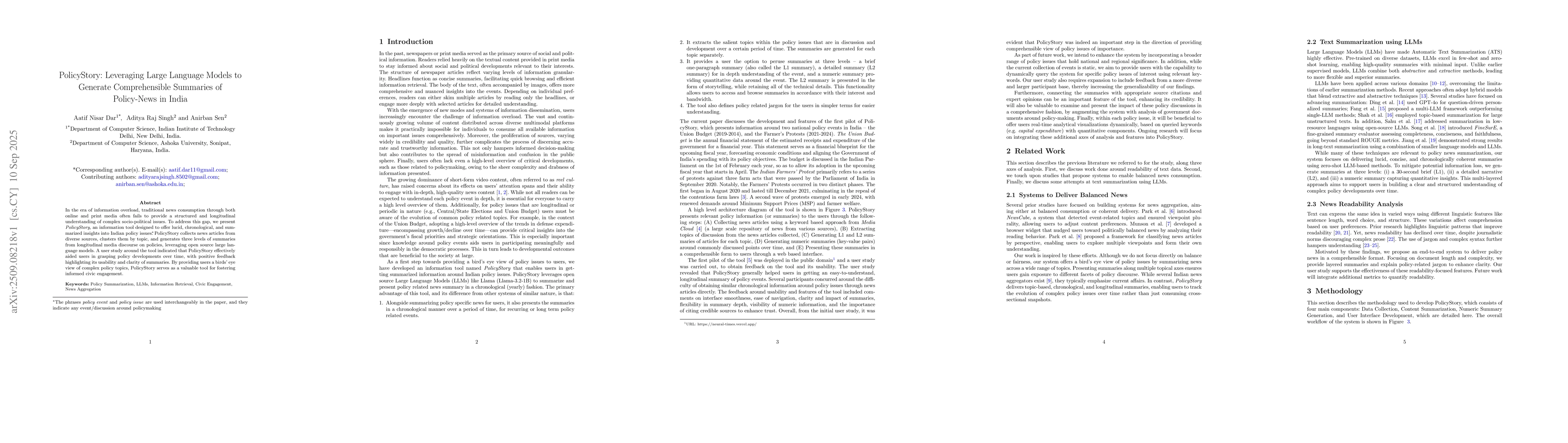 In the era of information overload, traditional news consumption through both online and print media often fails to provide a structured and longitudinal understanding of complex sociopolitical issues. To address this gap, we present PolicyStory, an information tool designed to offer lucid, chronological, and summarized insights into Indian policy issues. PolicyStory collects news articles from diverse sources, clusters them by topic, and generates three levels of summaries from longitudinal media discourse on policies, leveraging open source large language models. A user study around the tool indicated that PolicyStory effectively aided users in grasping policy developments over time, with positive feedback highlighting its usability and clarity of summaries. By providing users a birds' eye view of complex policy topics, PolicyStory serves as a valuable resource.