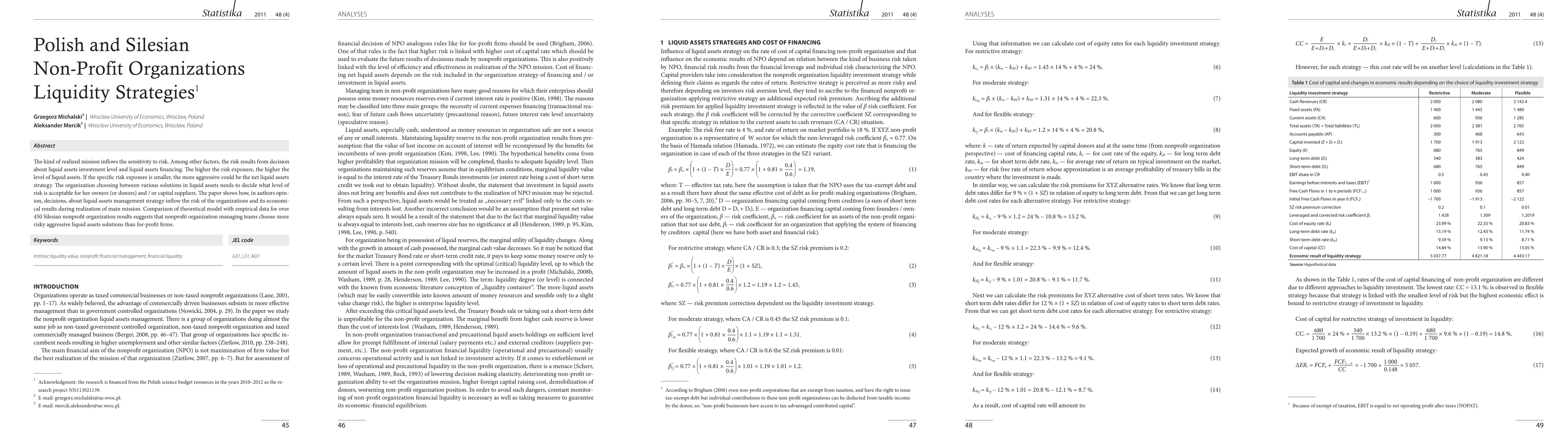The kind of realized mission inflows the sensitivity to risk. Among other factors, the risk results from decision about liquid assets investment level and liquid assets financing. The higher the risk exposure, the higher the level of liquid assets. If the specific risk exposure is smaller, the more aggressive could be the net liquid assets strategy. The organization choosing between various solutions in liquid assets needs to decide what level of risk is acceptable for her owners (or donors) and / or capital suppliers. The paper shows how, in authors opinion, decisions, about liquid assets management strategy inflow the risk of the organizations and its economical results during realization of main mission. Comparison of theoretical model with empirical data for over 450 Silesian nonprofit organization results suggests that nonprofit organization managing teams choose more risky aggressive liquid assets solutions than for-profit firms.