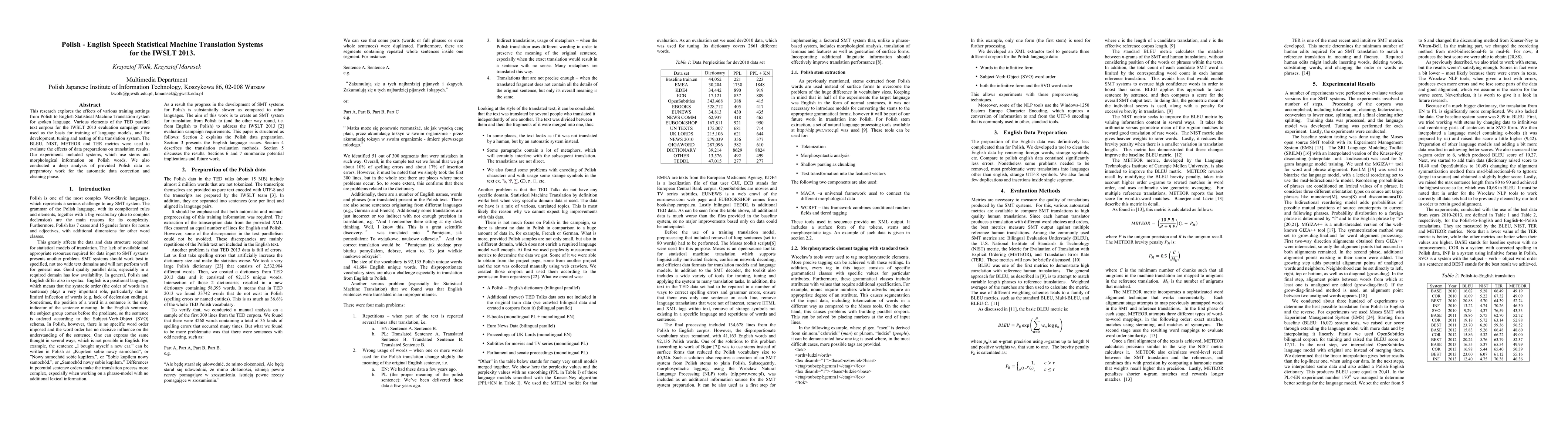 This study investigates the impact of different training settings on Polish-to-English statistical machine translation systems for spoken language, using TED parallel text corpora for IWSLT 2013. Evaluation metrics include BLEU, NIST, METEOR, and TER, with a focus on systems incorporating stems and morphological information, and an analysis of Polish data for automatic correction.