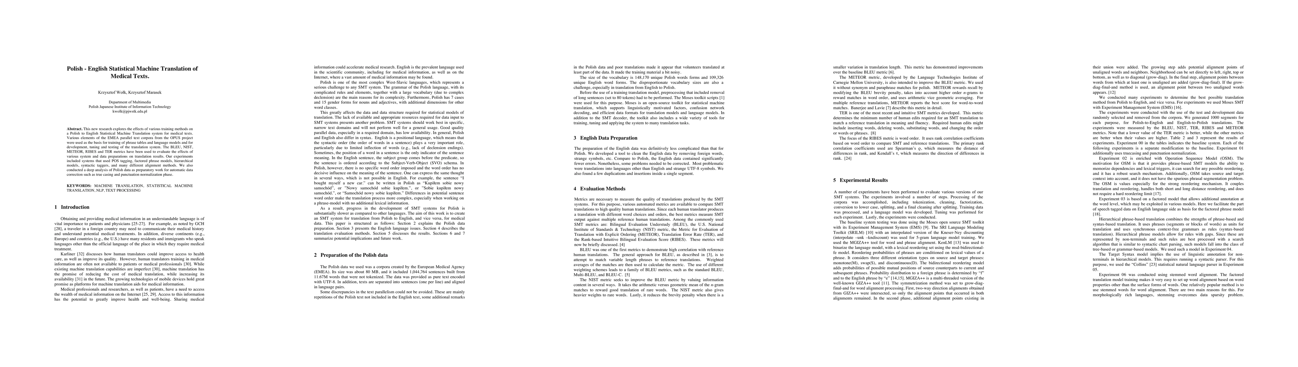 This new research explores the effects of various training methods on a Polish to English Statistical Machine Translation system for medical texts. Various elements of the EMEA parallel text corpora from the OPUS project were used as the basis for training of phrase tables and language models and for development, tuning and testing of the translation system. The BLEU, NIST, METEOR, RIBES and TER metrics have been used to evaluate the effects of various system and data preparations on translation results. Our experiments included systems that used POS tagging, factored phrase models, hierarchical models, syntactic taggers, and many different alignment methods. We also conducted a deep analysis of Polish data as preparatory work for automatic data correction such as true casing and punctuation normalization phase.