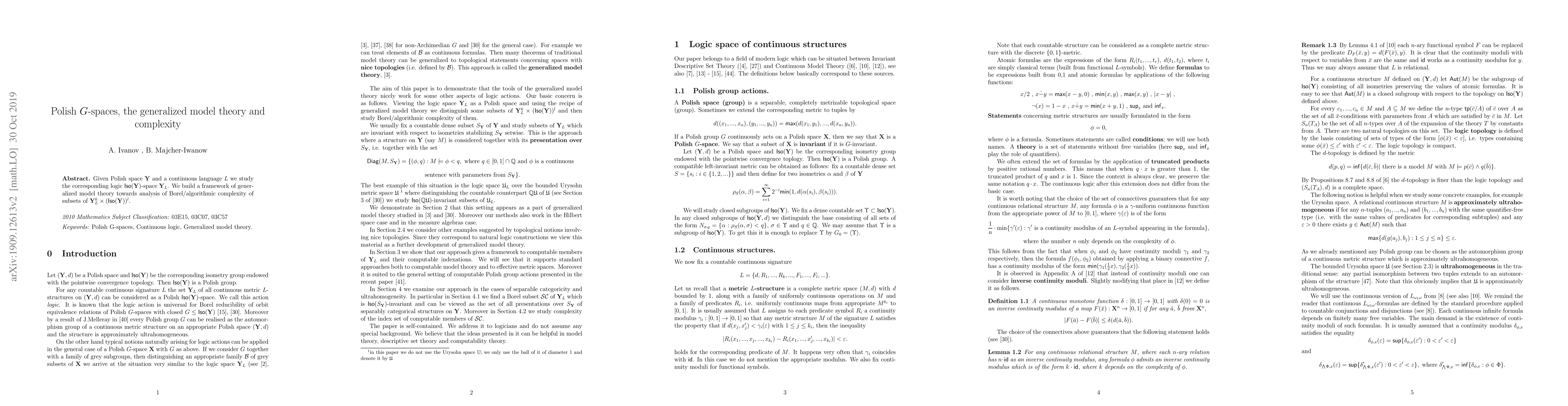 This research paper develops a framework for analyzing Borel/algorithmic complexity of subsets in Polish spaces, utilizing generalized model theory and logic spaces.
