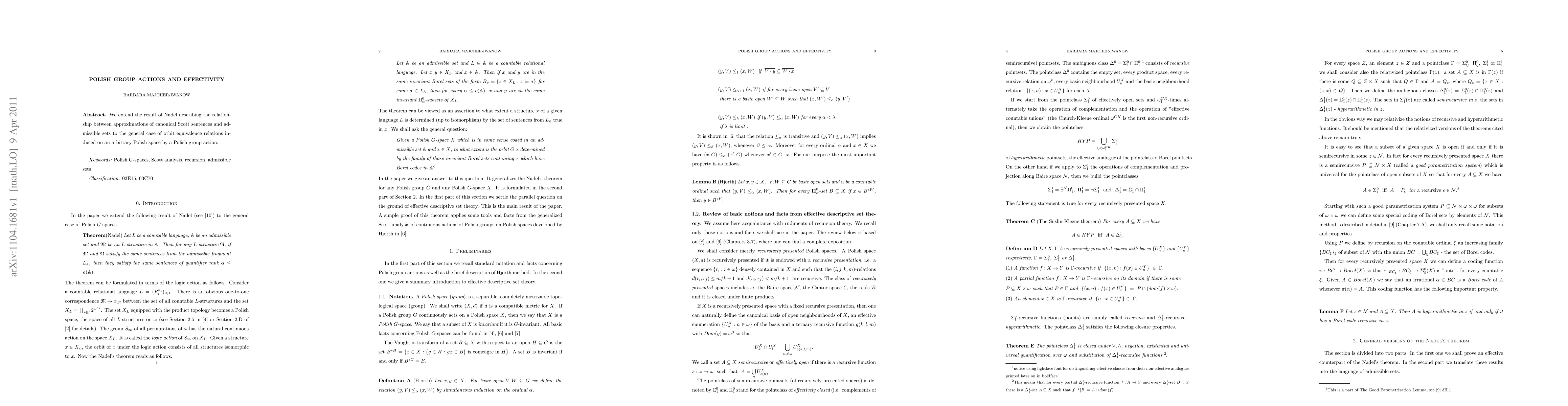 Summary: This paper extends Nadel's findings on the connection between canonical Scott sentences and admissible sets to the broader context of orbit equivalence relations generated by Polish group actions on any Polish space. The focus is on the effectivity of these relationships.