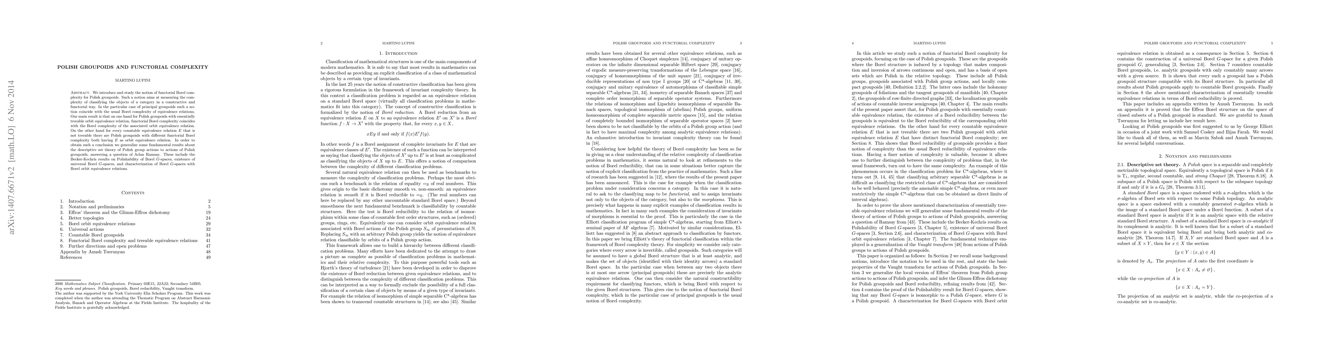 The paper develops the theory of functorial Borel complexity for Polish groupoids, generalizing key results from the descriptive set theory of Polish group actions to Polish groupoid actions.