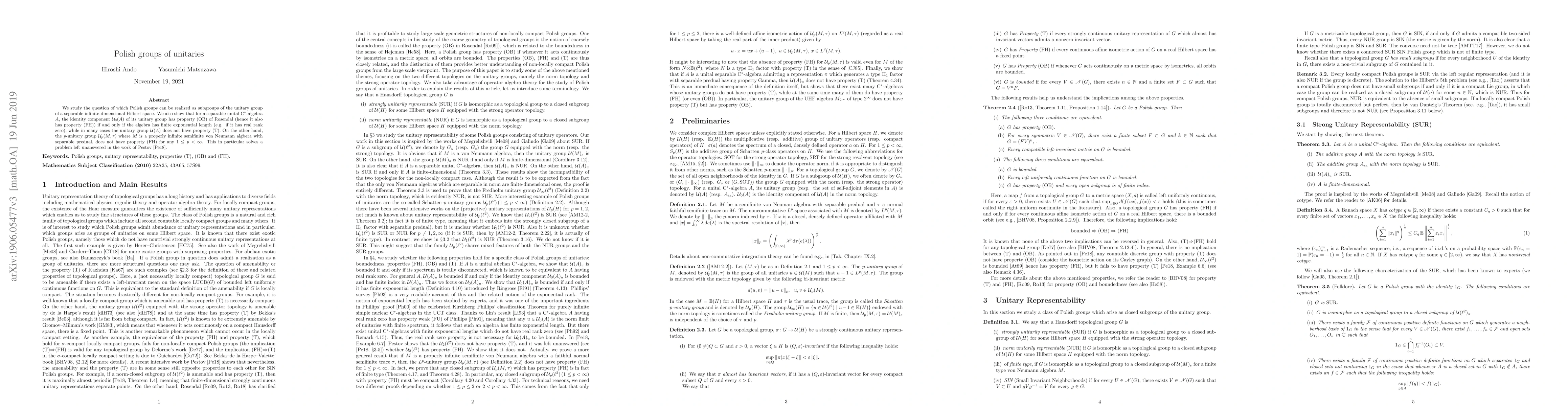 This paper explores which Polish groups can be embedded in the unitary group of a separable infinite-dimensional Hilbert space and investigates properties of unitary groups in separable unital C$^*$-algebras, including the relationship between finite exponential length and properties (OB) and (FH). It also addresses the lack of property (FH) in $p$-unitary groups for certain von Neumann algebras.