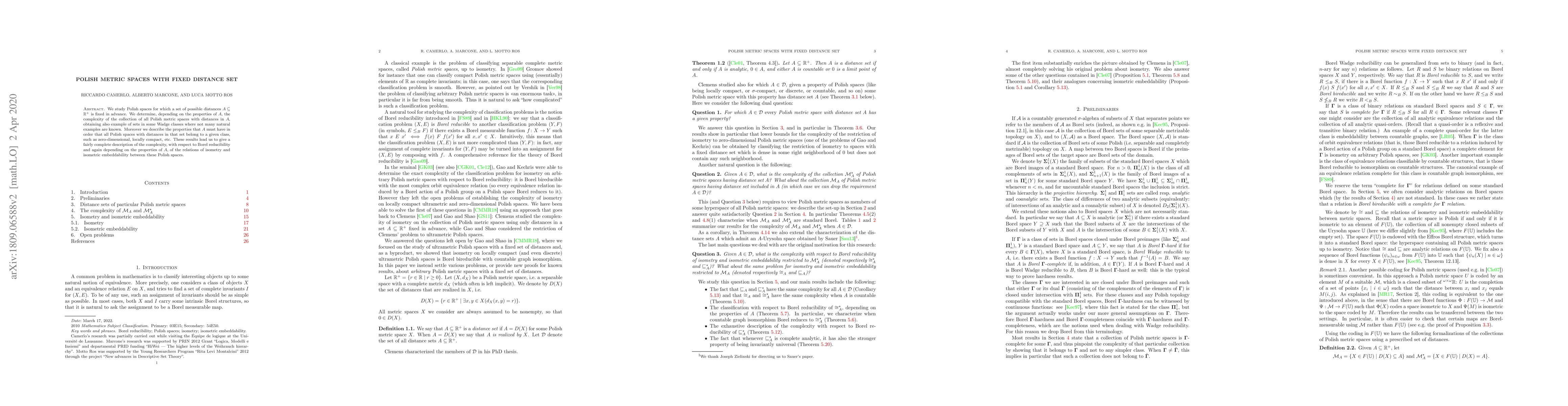 This paper investigates Polish metric spaces with a predetermined set of possible distances $A \subseteq \mathbb{R}^+$, analyzing the complexity of such spaces based on $A$'s properties and classifying them within various Wadge classes. It also determines conditions for $A$ ensuring that all spaces belong to specific classes like zero-dimensional or locally compact.