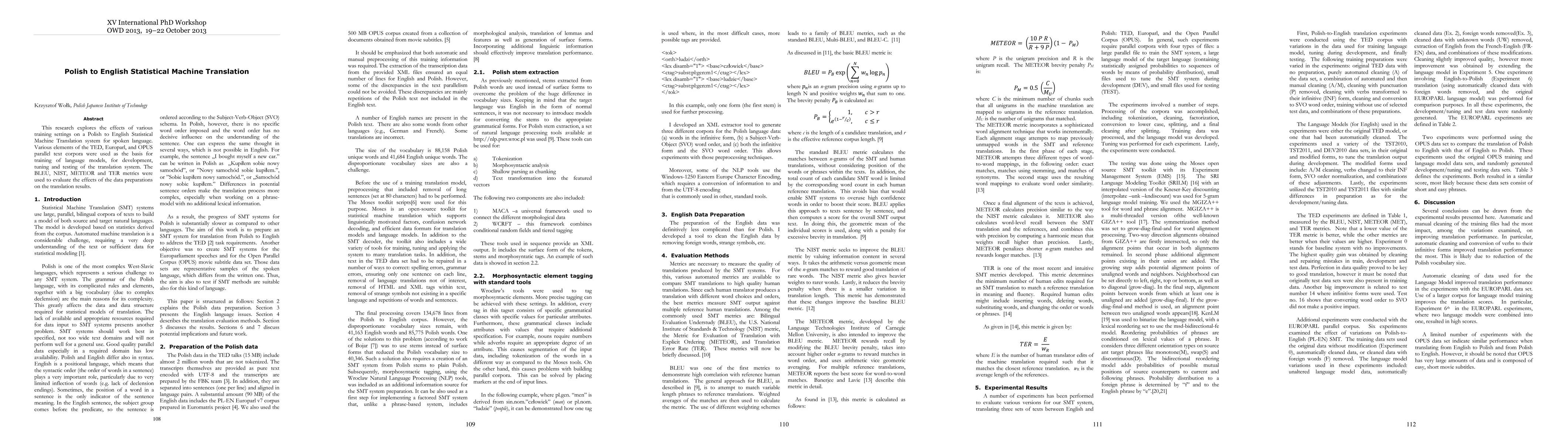 This study investigates the impact of different training settings on a Polish-to-English statistical machine translation system for spoken language, utilizing TED, Europarl, and OPUS corpora, and evaluates the results using BLEU, NIST, METEOR, and TER metrics. The findings highlight the effectiveness of various data preparation methods on translation accuracy.