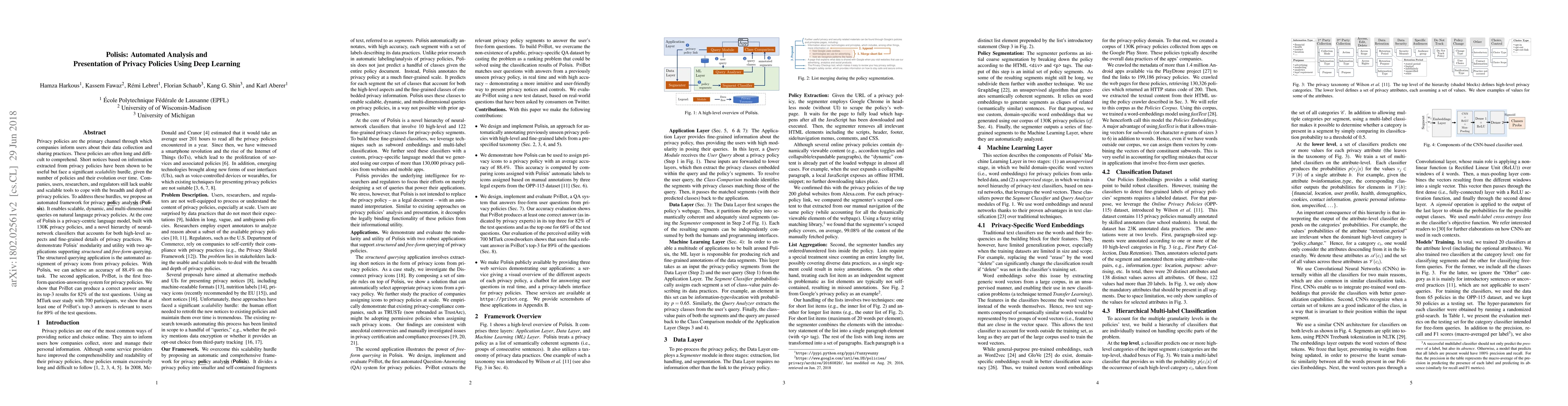 Polisis is an automated framework for analyzing and presenting privacy policies using deep learning, featuring a privacy-centric language model and neural classifiers. It enables scalable, dynamic, and multi-dimensional queries, demonstrated through applications for automated privacy icon assignment and a free-form question-answering system, PriBot.