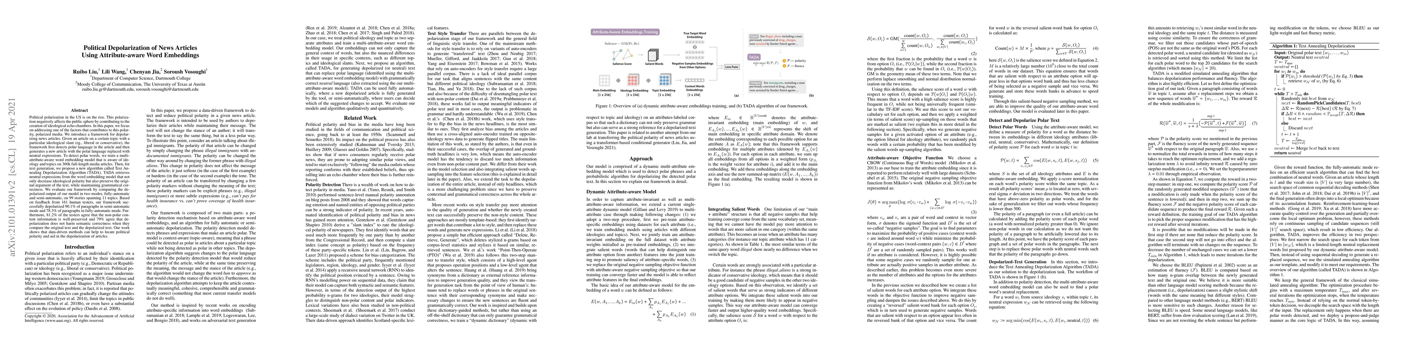 Political polarization in the US is on the rise. This polarization negatively affects the public sphere by contributing to the creation of ideological echo chambers. In this paper, we focus on addressing one of the factors that contributes to this polarity, polarized media. We introduce a framework for depolarizing news articles. Given an article on a certain topic with a particular ideological slant (eg., liberal or conservative), the framework first detects polar language in the article and then generates a new article with the polar language replaced with neutral expressions. To detect polar words, we train a multi-attribute-aware word embedding model that is aware of ideology and topics on 360k full-length media articles. Then, for text generation, we propose a new algorithm called Text Annealing Depolarization Algorithm (TADA). TADA retrieves neutral expressions from the word embedding model that not only decrease ideological polarity but also preserve the original argument of the text, while maintaining grammatical correctness. We evaluate our framework by comparing the depolarized output of our model in two modes, fully-automatic and semi-automatic, on 99 stories spanning 11 topics. Based on feedback from 161 human testers, our framework successfully depolarized 90.1% of paragraphs in semi-automatic mode and 78.3% of paragraphs in fully-automatic mode. Furthermore, 81.2% of the testers agree that the non-polar content information is well-preserved and 79% agree that depolarization does not harm semantic correctness when they compare the original text and the depolarized text. Our work shows that data-driven methods can help to locate political polarity and aid in the depolarization of articles.
