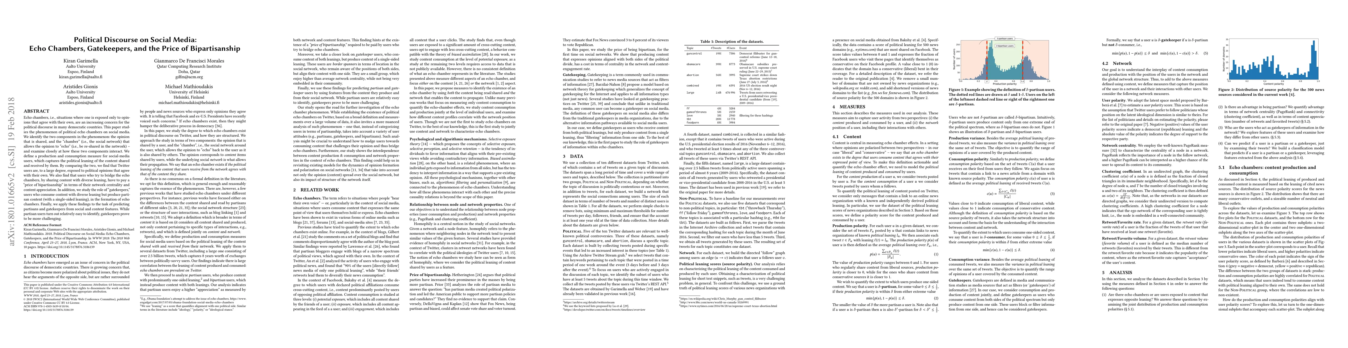 Echo chambers, i.e., situations where one is exposed only to opinions that agree with their own, are an increasing concern for the political discourse in many democratic countries. This paper studies the phenomenon of political echo chambers on social media. We identify the two components in the phenomenon: the opinion that is shared ('echo'), and the place that allows its exposure ('chamber' --- the social network), and examine closely at how these two components interact. We define a production and consumption measure for social-media users, which captures the political leaning of the content shared and received by them. By comparing the two, we find that Twitter users are, to a large degree, exposed to political opinions that agree with their own. We also find that users who try to bridge the echo chambers, by sharing content with diverse leaning, have to pay a 'price of bipartisanship' in terms of their network centrality and content appreciation. In addition, we study the role of 'gatekeepers', users who consume content with diverse leaning but produce partisan content (with a single-sided leaning), in the formation of echo chambers. Finally, we apply these findings to the task of predicting partisans and gatekeepers from social and content features. While partisan users turn out relatively easy to identify, gatekeepers prove to be more challenging.
