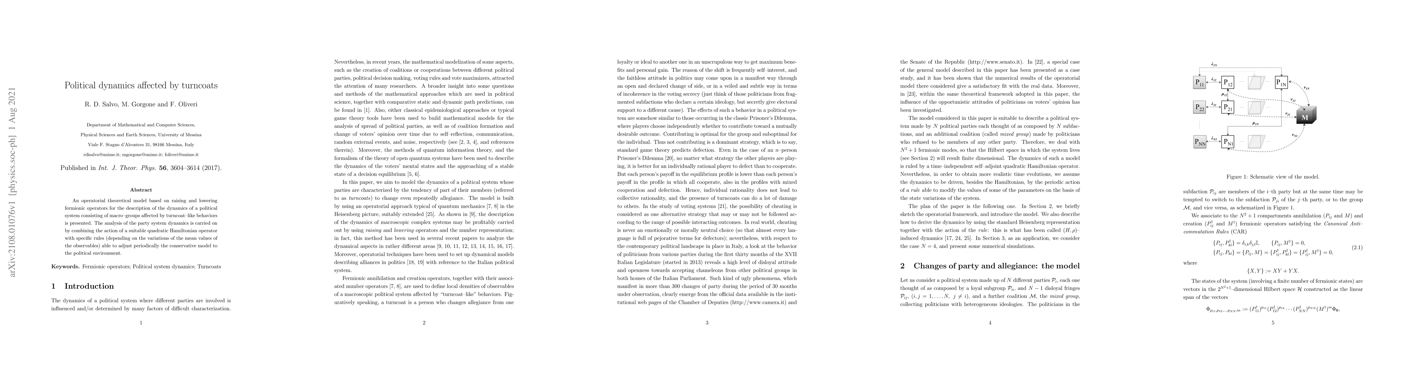 An operatorial theoretical model based on raising and lowering fermionic operators for the description of the dynamics of a political system consisting of macro--groups affected by turncoat--like behaviors is presented. The analysis of the party system dynamics is carried on by combining the action of a suitable quadratic Hamiltonian operator with specific rules (depending on the variations of the mean values of the observables) able to adjust periodically the conservative model to the political environment.