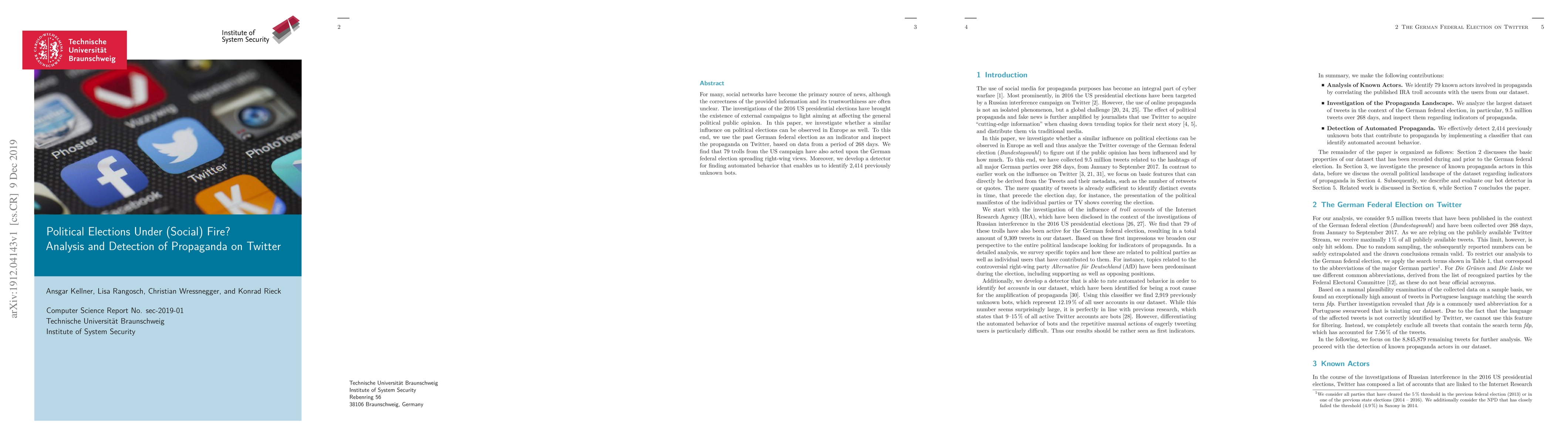 This paper examines the presence of propaganda on Twitter during the German federal election, finding that 79 US trolls from the 2016 campaign spread right-wing views. It also develops a detector to identify 2,414 previously unknown bots exhibiting automated behavior.