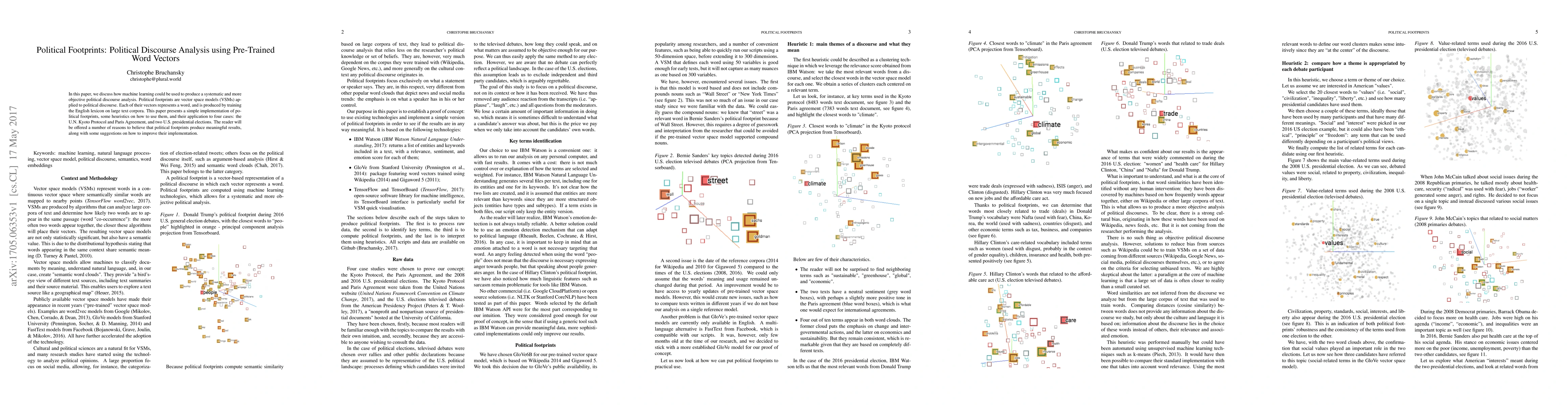 This paper explores using machine learning and pre-trained word vectors for systematic political discourse analysis, applying "political footprints" to analyze texts related to the U.N. Kyoto Protocol, Paris Agreement, and U.S. presidential elections, aiming for more objective results and offering suggestions for enhancements.
