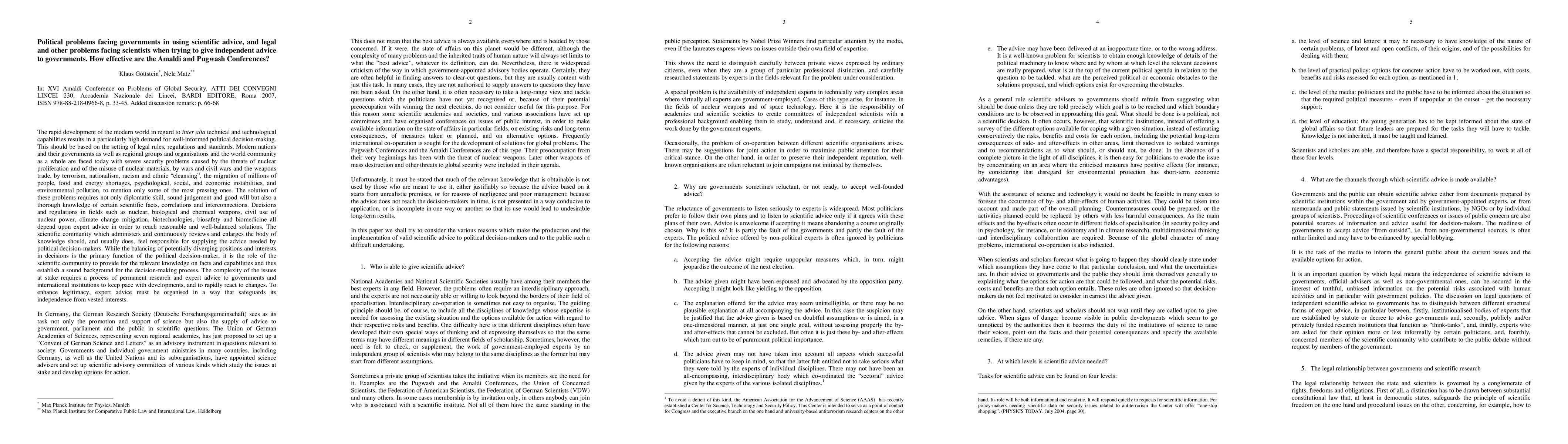 It is the role of the scientific community to provide for the knowledge of scientific facts and technical capabilities as a background for political decision-making. The reasons are given why governments are sometimes not ready to accept well-founded advice. The legal relationship between governments and scientific research are considered. The options available to the scientific community for supplying useful advice to decision-makers and to the public in questions of general concern are delineated.