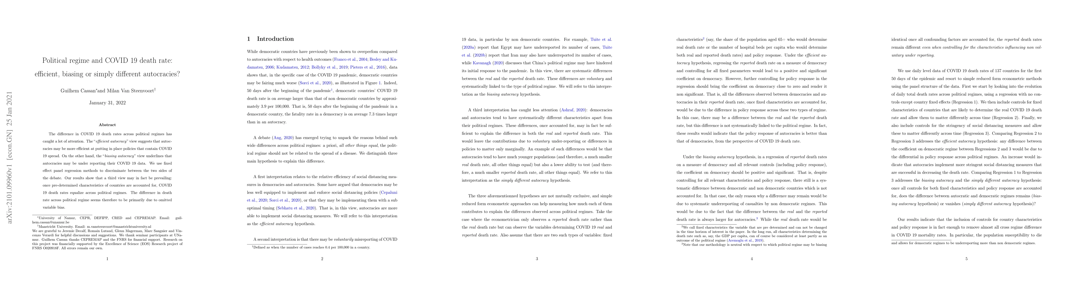 The difference in COVID 19 death rates across political regimes has caught a lot of attention. The "efficient autocracy" view suggests that autocracies may be more efficient at putting in place policies that contain COVID 19 spread. On the other hand, the "biasing autocracy" view underlines that autocracies may be under reporting their COVID 19 data. We use fixed effect panel regression methods to discriminate between the two sides of the debate. Our results show that a third view may in fact be prevailing: once pre-determined characteristics of countries are accounted for, COVID 19 death rates equalize across political regimes. The difference in death rate across political regime seems therefore to be primarily due to omitted variable bias.