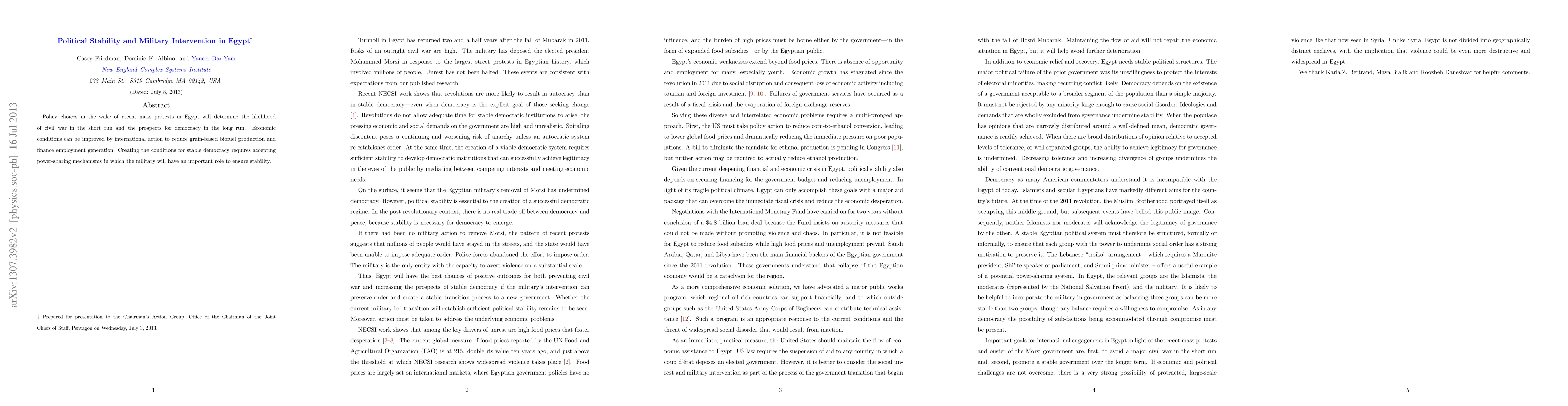 Policy choices in the wake of recent mass protests in Egypt will determine the likelihood of civil war in the short run and the prospects for democracy in the long run. Economic conditions can be improved by international action to reduce grain-based biofuel production and finance employment generation. Creating the conditions for stable democracy requires accepting power-sharing mechanisms in which the military will have an important role.
