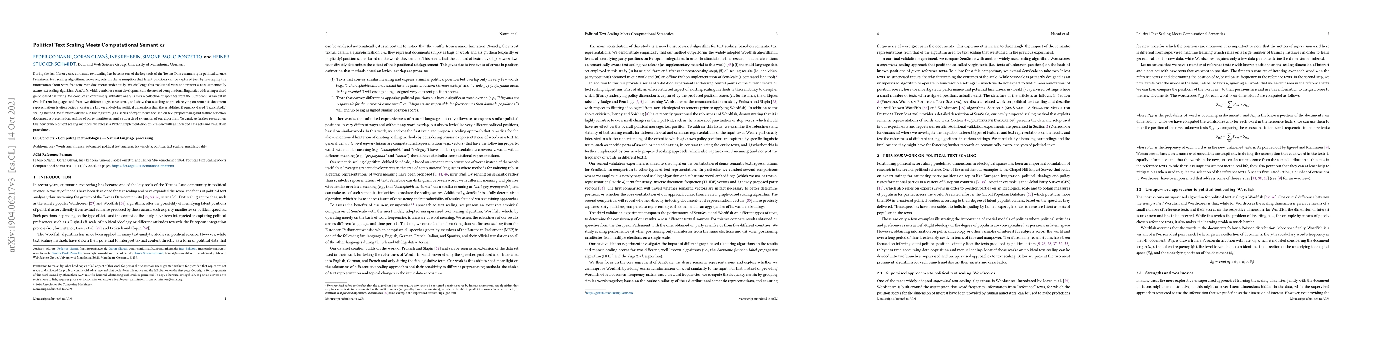 During the last fifteen years, automatic text scaling has become one of the key tools of the Text as Data community in political science. Prominent text scaling algorithms, however, rely on the assumption that latent positions can be captured just by leveraging the information about word frequencies in documents under study. We challenge this traditional view and present a new, semantically aware text scaling algorithm, SemScale, which combines recent developments in the area of computational linguistics with unsupervised graph-based clustering. We conduct an extensive quantitative analysis over a collection of speeches from the European Parliament in five different languages and from two different legislative terms, and show that a scaling approach relying on semantic document representations is often better at capturing known underlying political dimensions than the established frequency-based (i.e., symbolic) scaling method. We further validate our findings through a series of experiments focused on text preprocessing and feature selection, document representation, scaling of party manifestos, and a supervised extension of our algorithm. To catalyze further research on this new branch of text scaling methods, we release a Python implementation of SemScale with all included data sets and evaluation procedures.