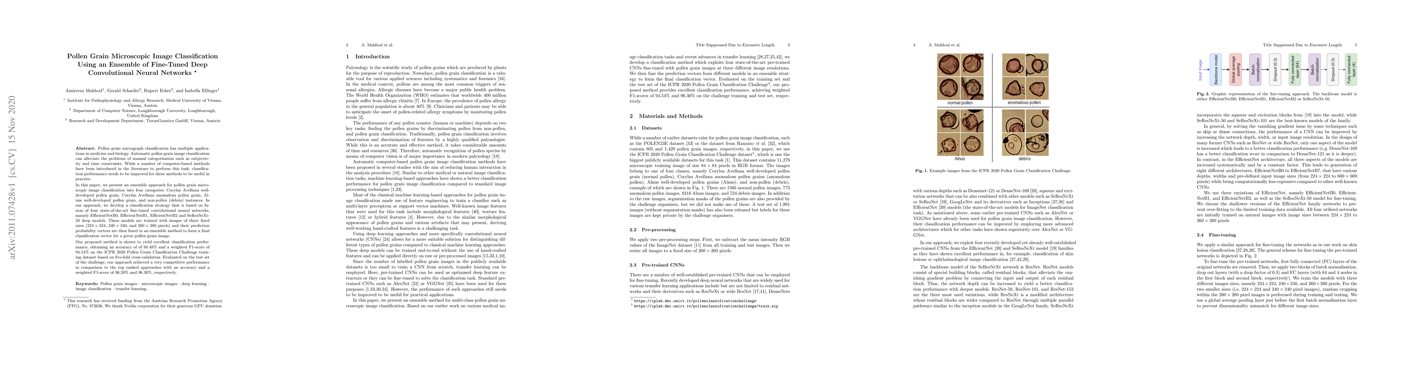 This paper proposes an ensemble method using four fine-tuned convolutional neural networks for classifying pollen grains into four categories. The approach achieves high accuracy of 94.48% and a weighted F1-score of 94.54% on the training dataset, and 96.28% accuracy and 96.30% weighted F1-score on the test dataset, outperforming other methods.