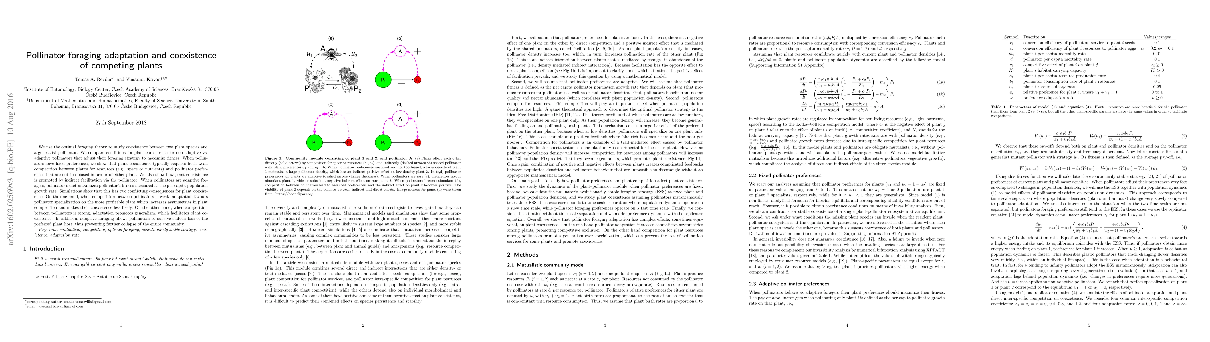 We use the optimal foraging theory to study coexistence between two plant species and a generalist pollinator. We compare conditions for plant coexistence for non-adaptive vs. adaptive pollinators that adjust their foraging strategy to maximize fitness. When pollinators have fixed preferences, we show that plant coexistence typically requires both weak competition between plants for resources (e.g., space or nutrients) and pollinator preferences that are not too biased in favour of either plant. We also show how plant coexistence is promoted by indirect facilitation via the pollinator. When pollinators are adaptive foragers, pollinator's diet maximizes pollinator's fitness measured as the per capita population growth rate. Simulations show that this has two conflicting consequences for plant coexistence. On the one hand, when competition between pollinators is weak, adaptation favours pollinator specialization on the more profitable plant which increases asymmetries in plant competition and makes their coexistence less likely. On the other hand, when competition between pollinators is strong, adaptation promotes generalism, which facilitates plant coexistence. In addition, adaptive foraging allows pollinators to survive sudden loss of the preferred plant host, thus preventing further collapse of the entire community. Keywords: mutualism, competition, optimal foraging, evolutionarily stable strategy, coexistence, adaptation rate