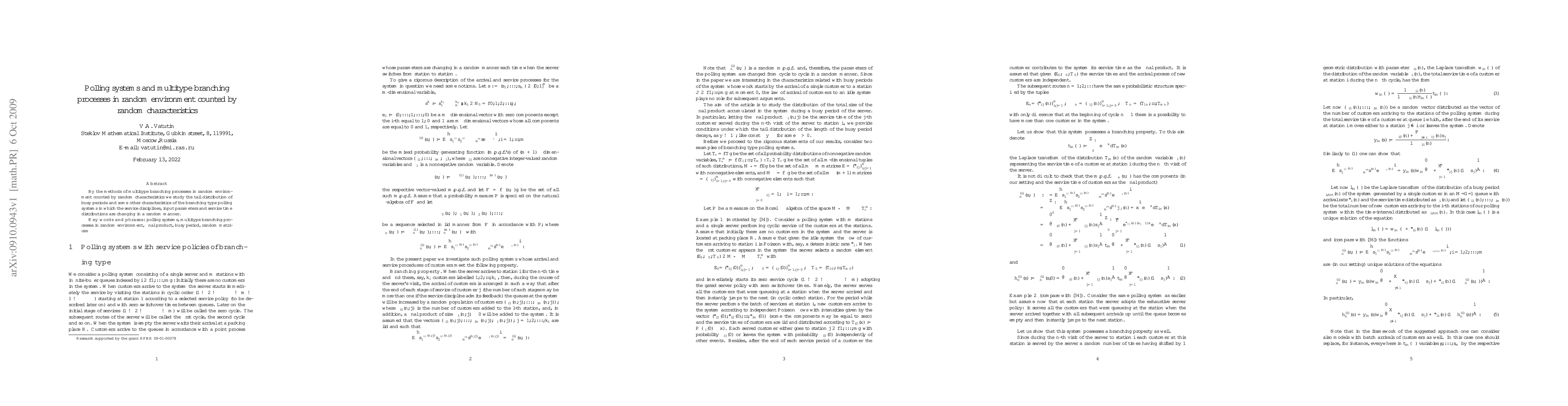 Summary: This paper investigates the tail distribution of busy periods in branching type polling systems using multitype branching processes in random environments, focusing on systems where service disciplines and input parameters vary randomly.