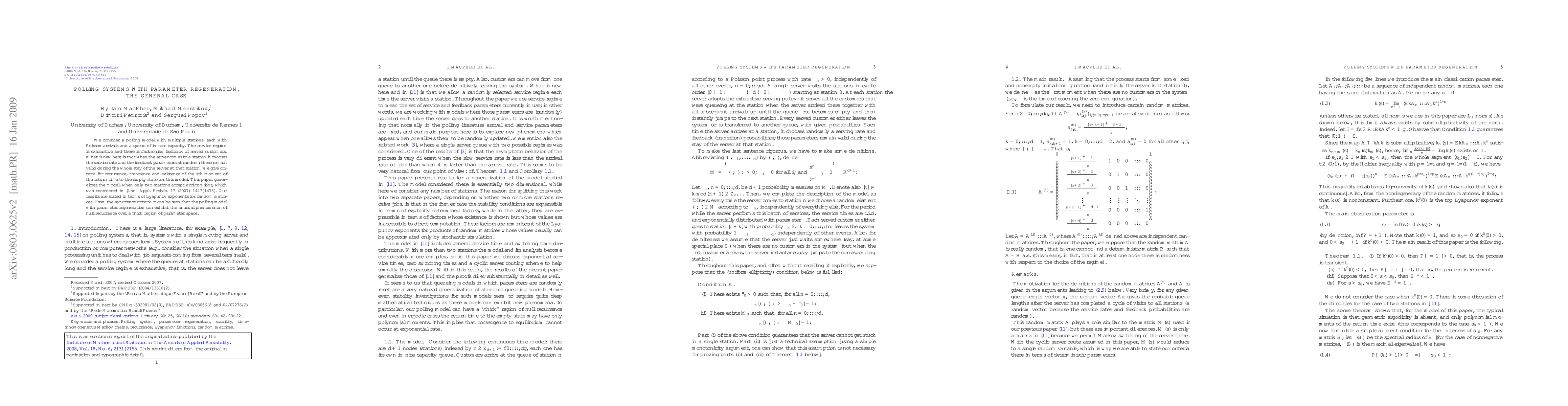 We consider a polling model with multiple stations, each with Poisson arrivals and a queue of infinite capacity. The service regime is exhaustive and there is Jacksonian feedback of served customers. What is new here is that when the server comes to a station it chooses the service rate and the feedback parameters at random; these remain valid during the whole stay of the server at that station. We give criteria for recurrence, transience and existence of the $s$th moment of the return time to the empty state for this model. This paper generalizes the model, when only two stations accept arriving jobs, which was considered in [Ann. Appl. Probab. 17 (2007) 1447--1473]. Our results are stated in terms of Lyapunov exponents for random matrices. From the recurrence criteria it can be seen that the polling model with parameter regeneration can exhibit the unusual phenomenon of null recurrence over a thick region of parameter space.