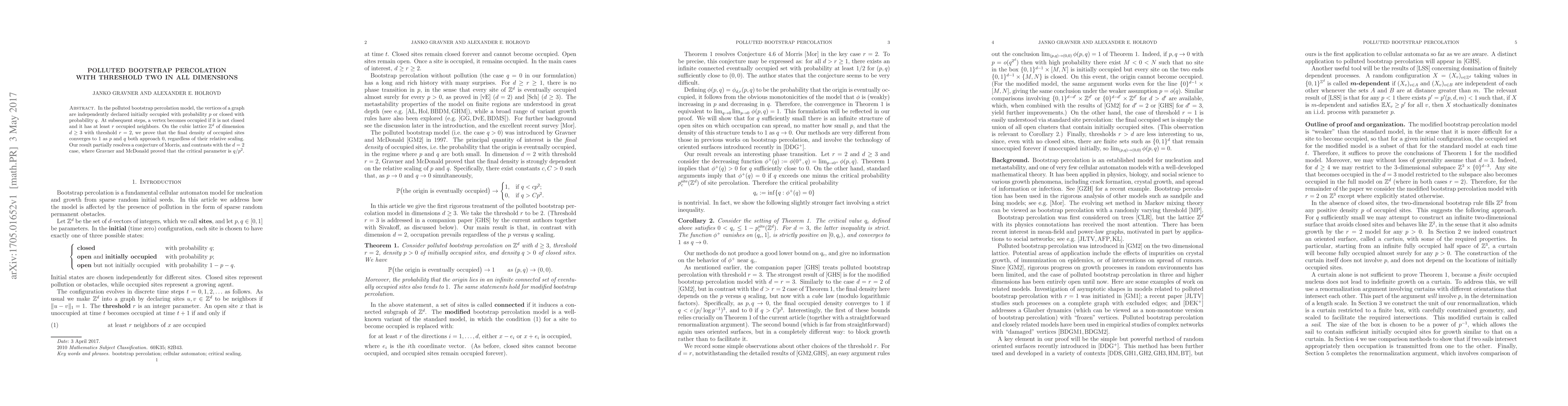 In the polluted bootstrap percolation model, the vertices of a graph are independently declared initially occupied with probability p or closed with probability q. At subsequent steps, a vertex becomes occupied if it is not closed and it has at least r occupied neighbors. On the cubic lattice Z^d of dimension d>=3 with threshold r=2, we prove that the final density of occupied sites converges to 1 as p and q both approach 0, regardless of their relative scaling. Our result partially resolves a conjecture of Morris, and contrasts with the d=2 case, where Gravner and McDonald proved that the critical parameter is q/{p^2}.